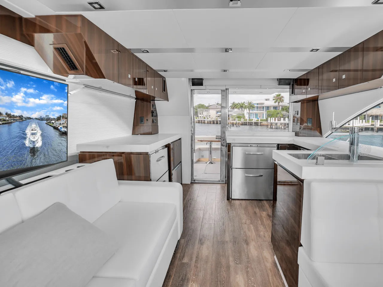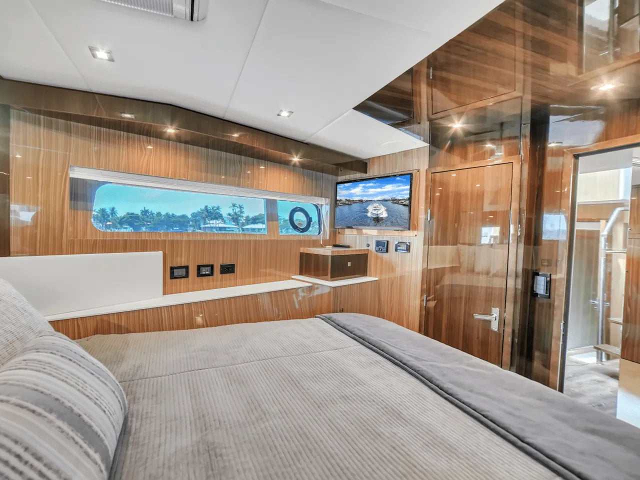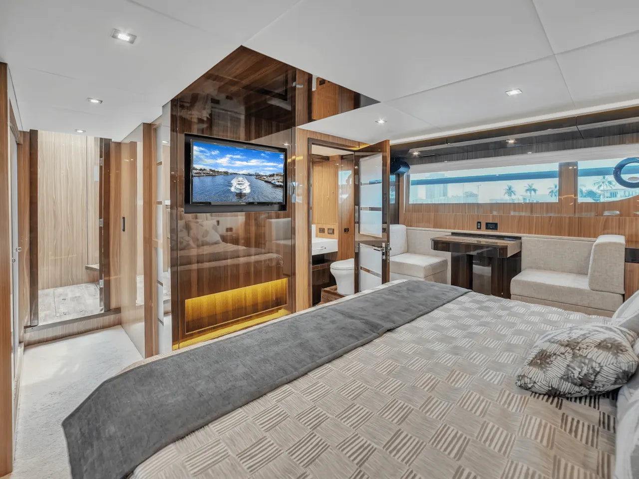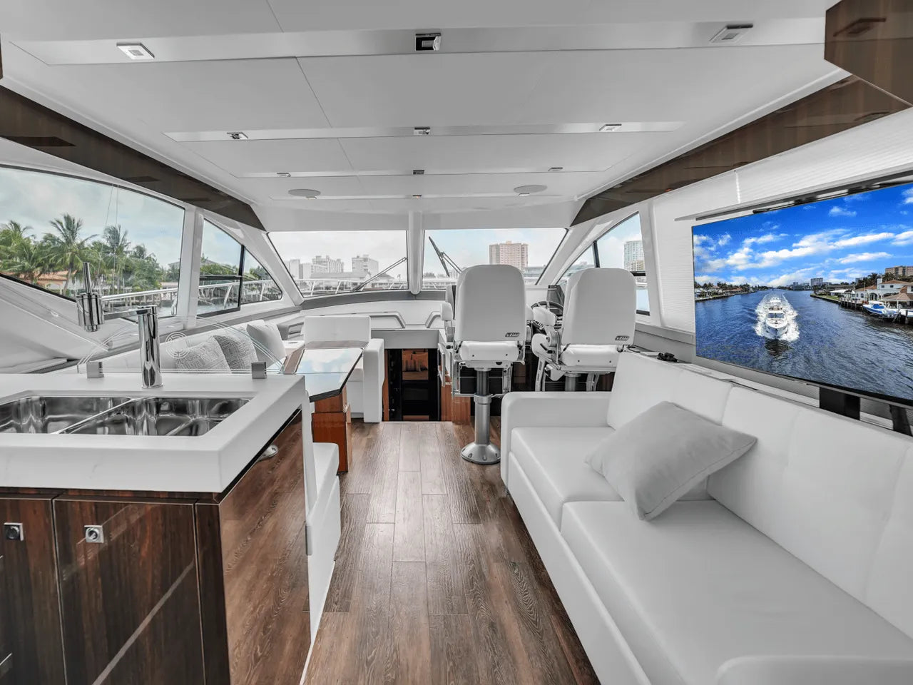 Inside, the bright salon flows seamlessly into the aft galley, which is fully equipped with high-end appliances. The full-beam master stateroom features a king berth, walk-in closet, and waterfall shower, complemented by a VIP stateroom and optional third guest cabin. Powered by twin Volvo IPS 950s, the 60 Fly cruises comfortably in the low 20-knot range with a top speed of 32 knots, offering a perfect balance of performance and luxury.