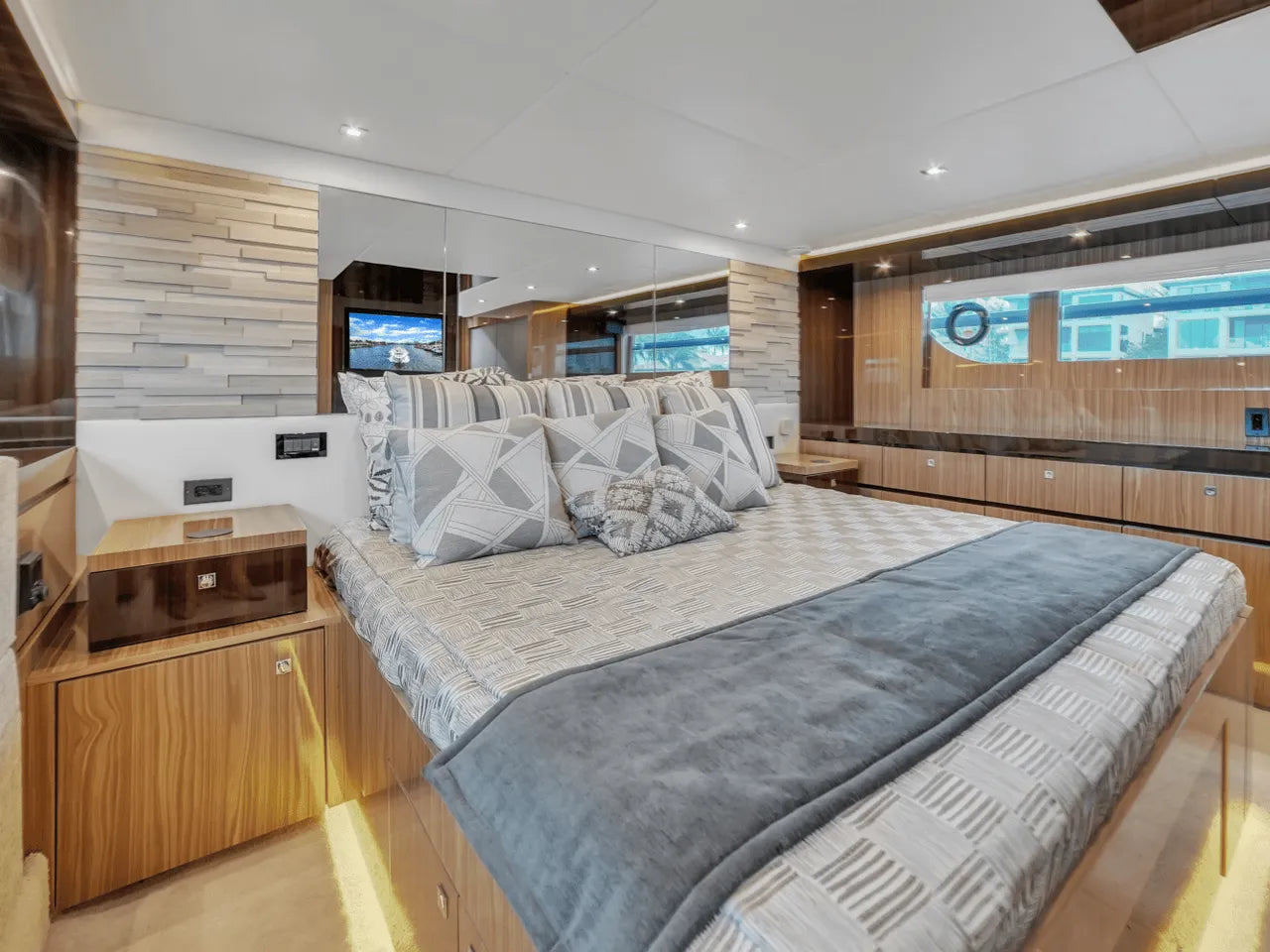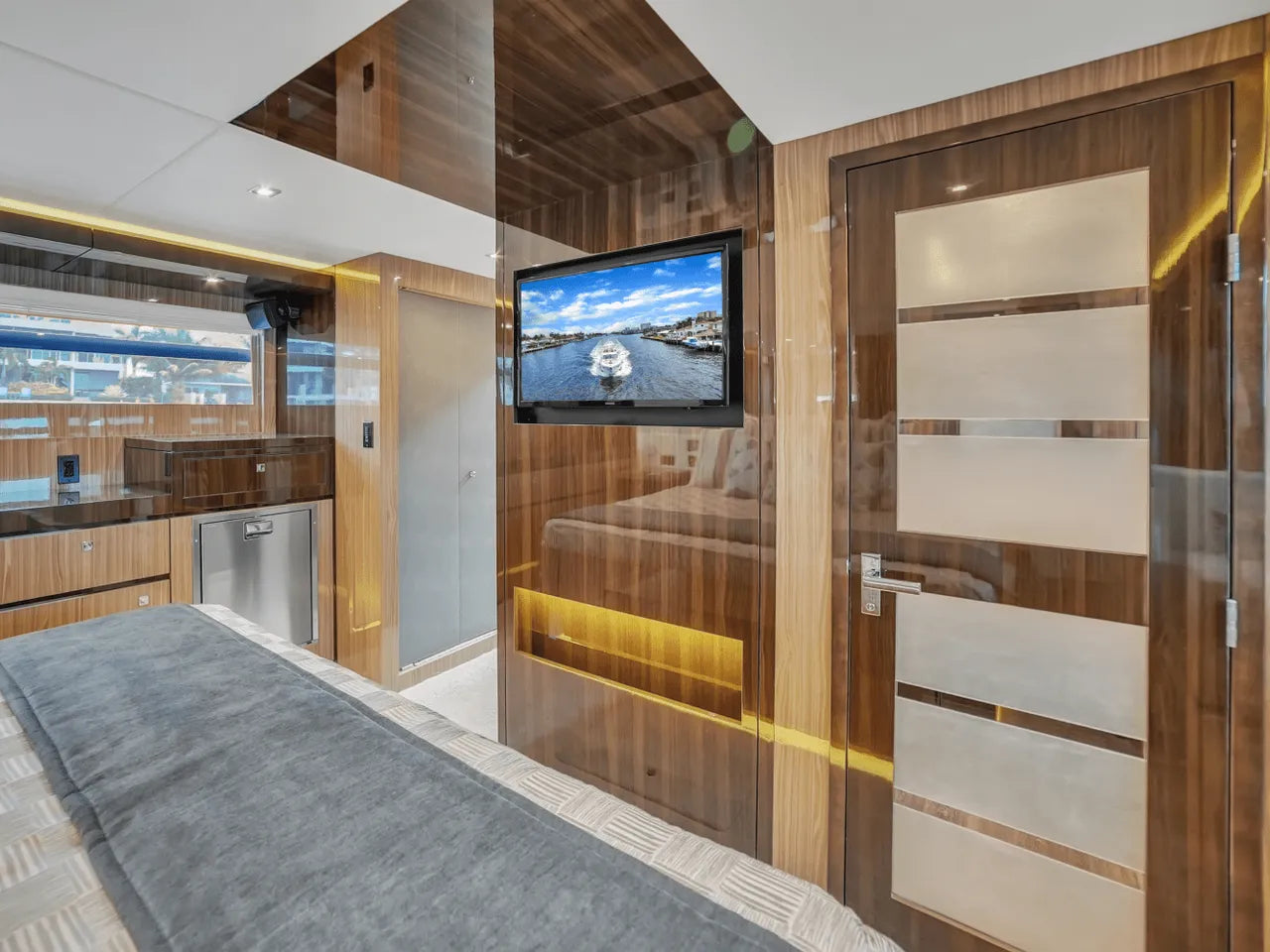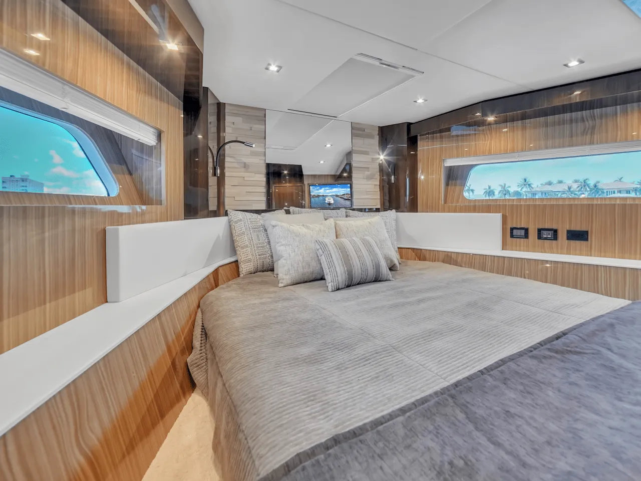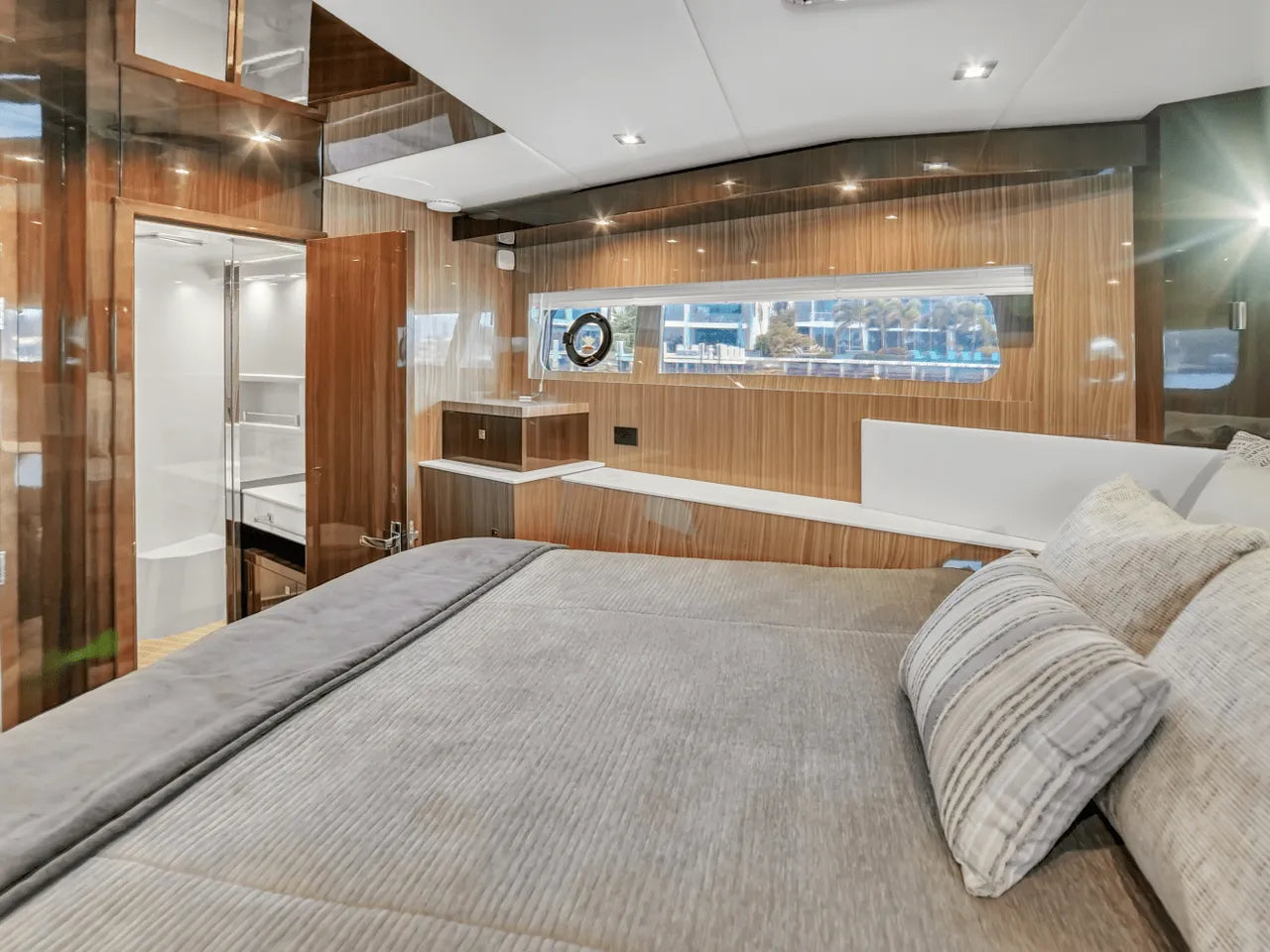 Inside, the bright salon flows seamlessly into the aft galley, which is fully equipped with high-end appliances. The full-beam master stateroom features a king berth, walk-in closet, and waterfall shower, complemented by a VIP stateroom and optional third guest cabin. Powered by twin Volvo IPS 950s, the 60 Fly cruises comfortably in the low 20-knot range with a top speed of 32 knots, offering a perfect balance of performance and luxury.