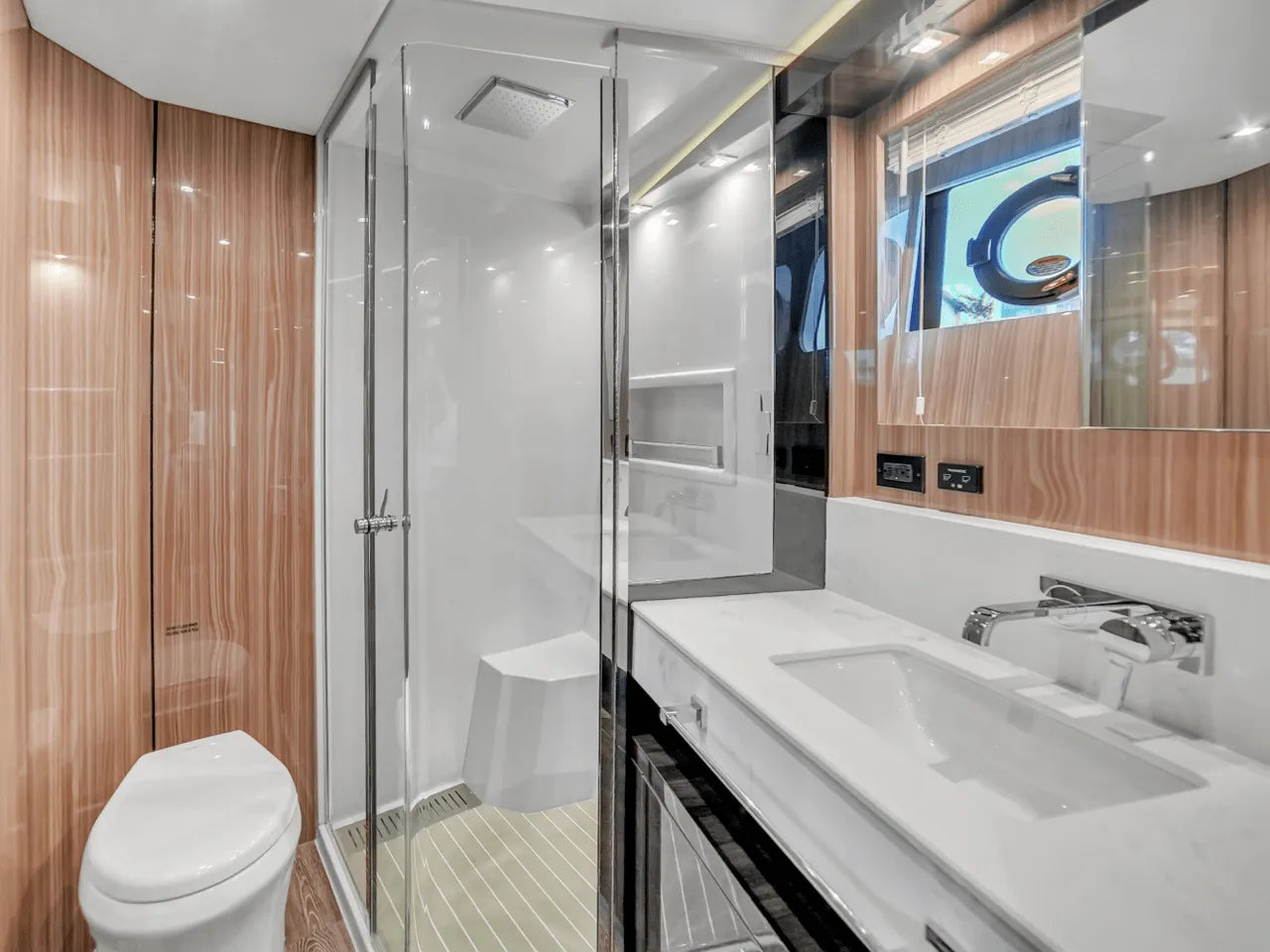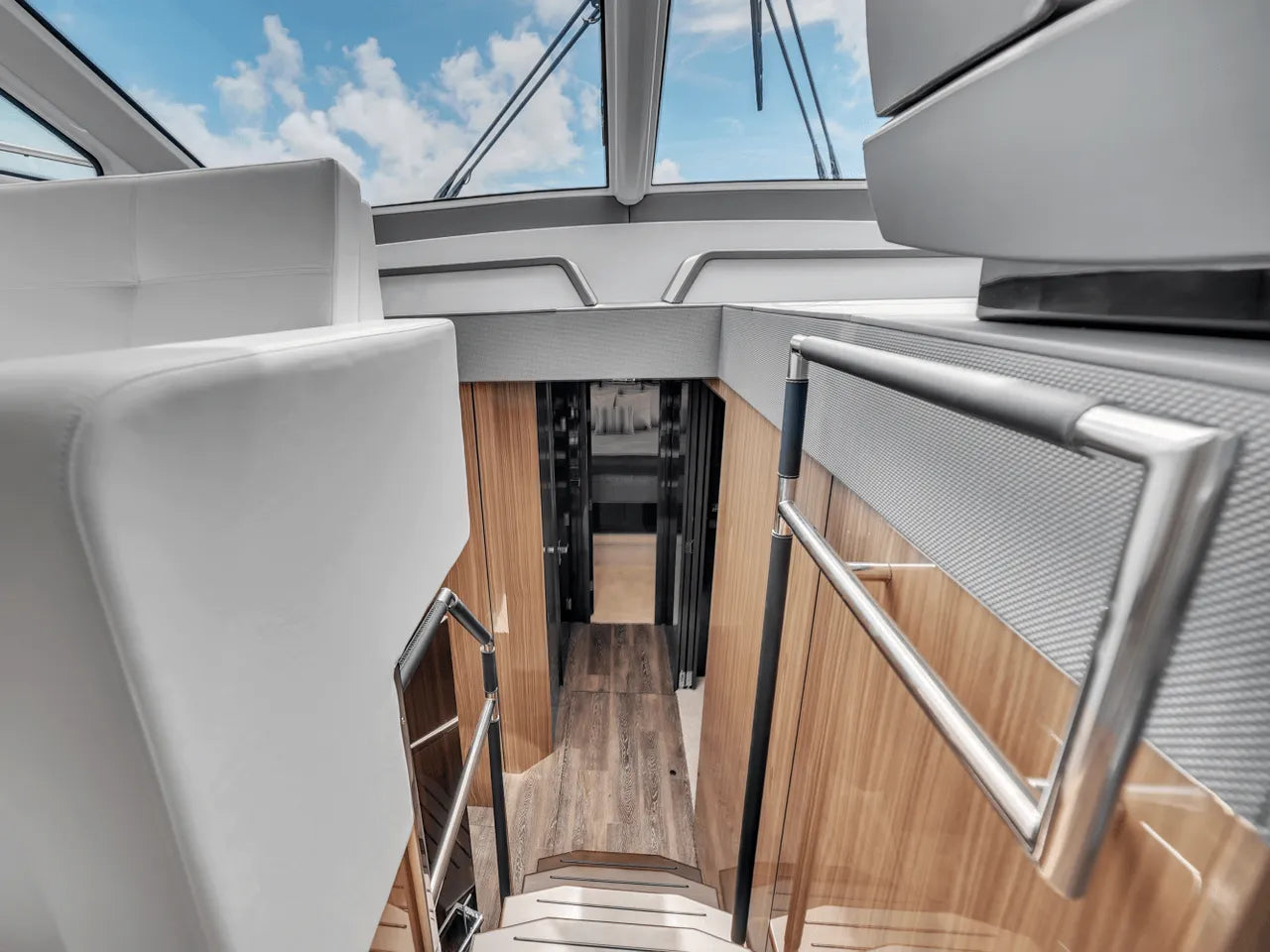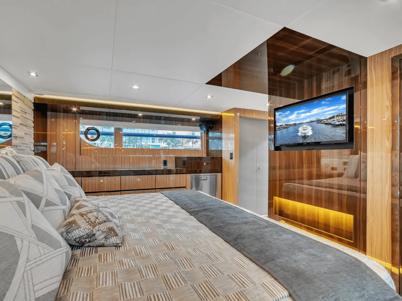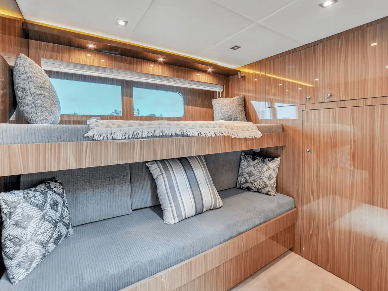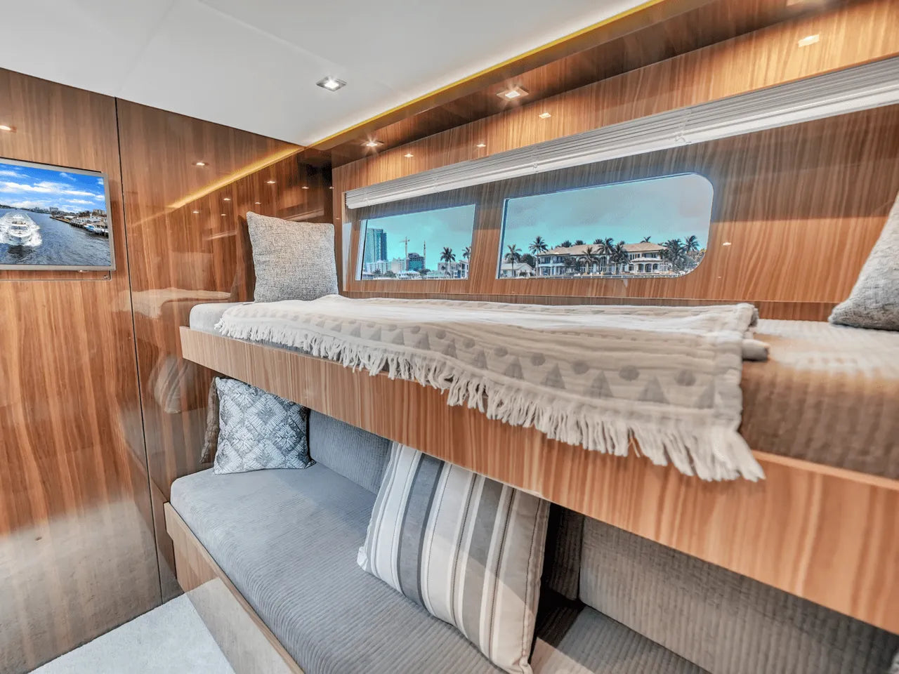 Inside, the bright salon flows seamlessly into the aft galley, which is fully equipped with high-end appliances. The full-beam master stateroom features a king berth, walk-in closet, and waterfall shower, complemented by a VIP stateroom and optional third guest cabin. Powered by twin Volvo IPS 950s, the 60 Fly cruises comfortably in the low 20-knot range with a top speed of 32 knots, offering a perfect balance of performance and luxury.