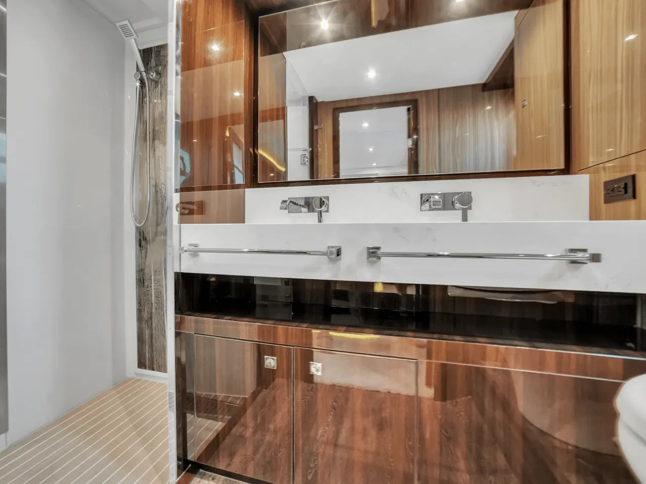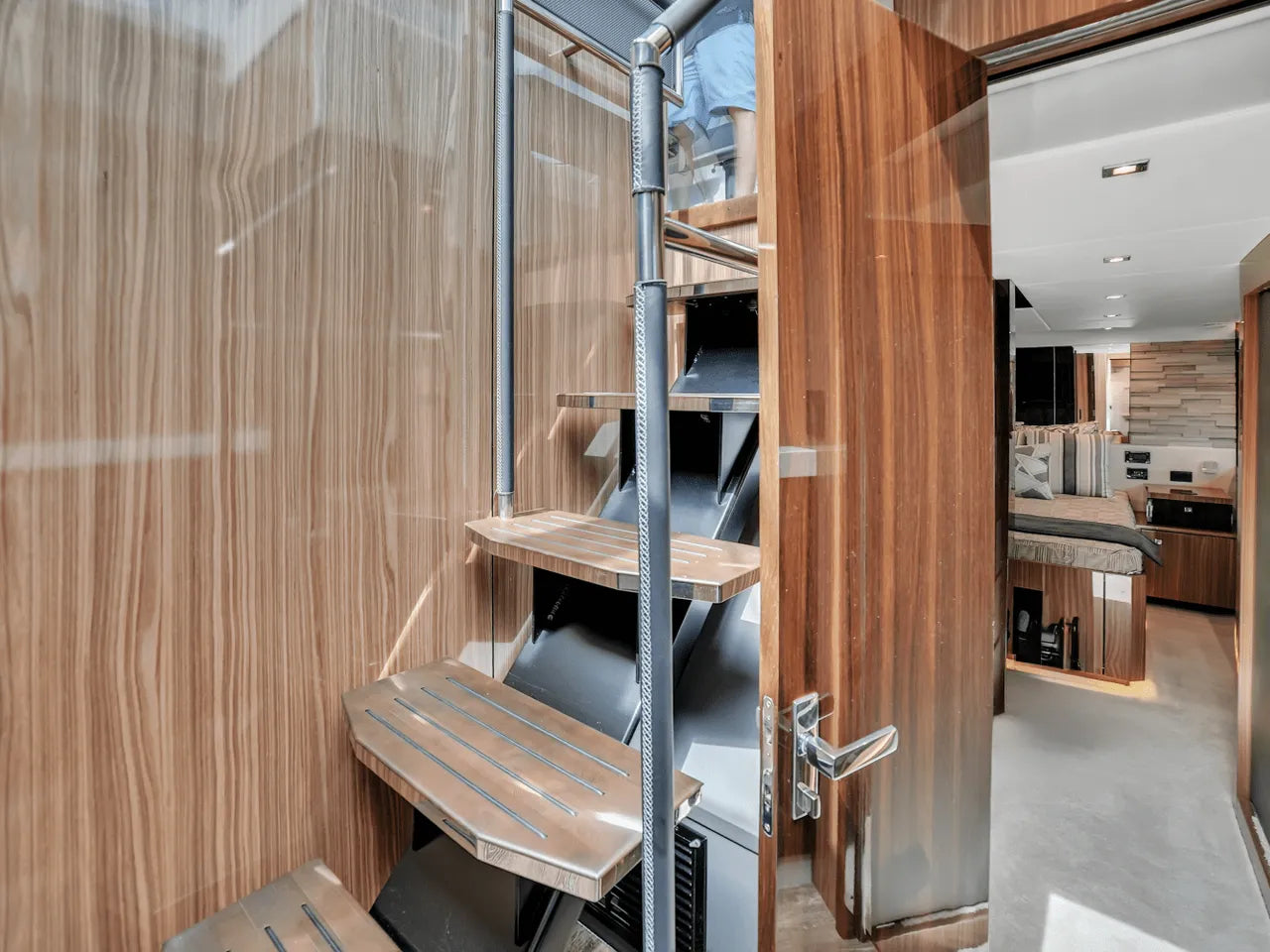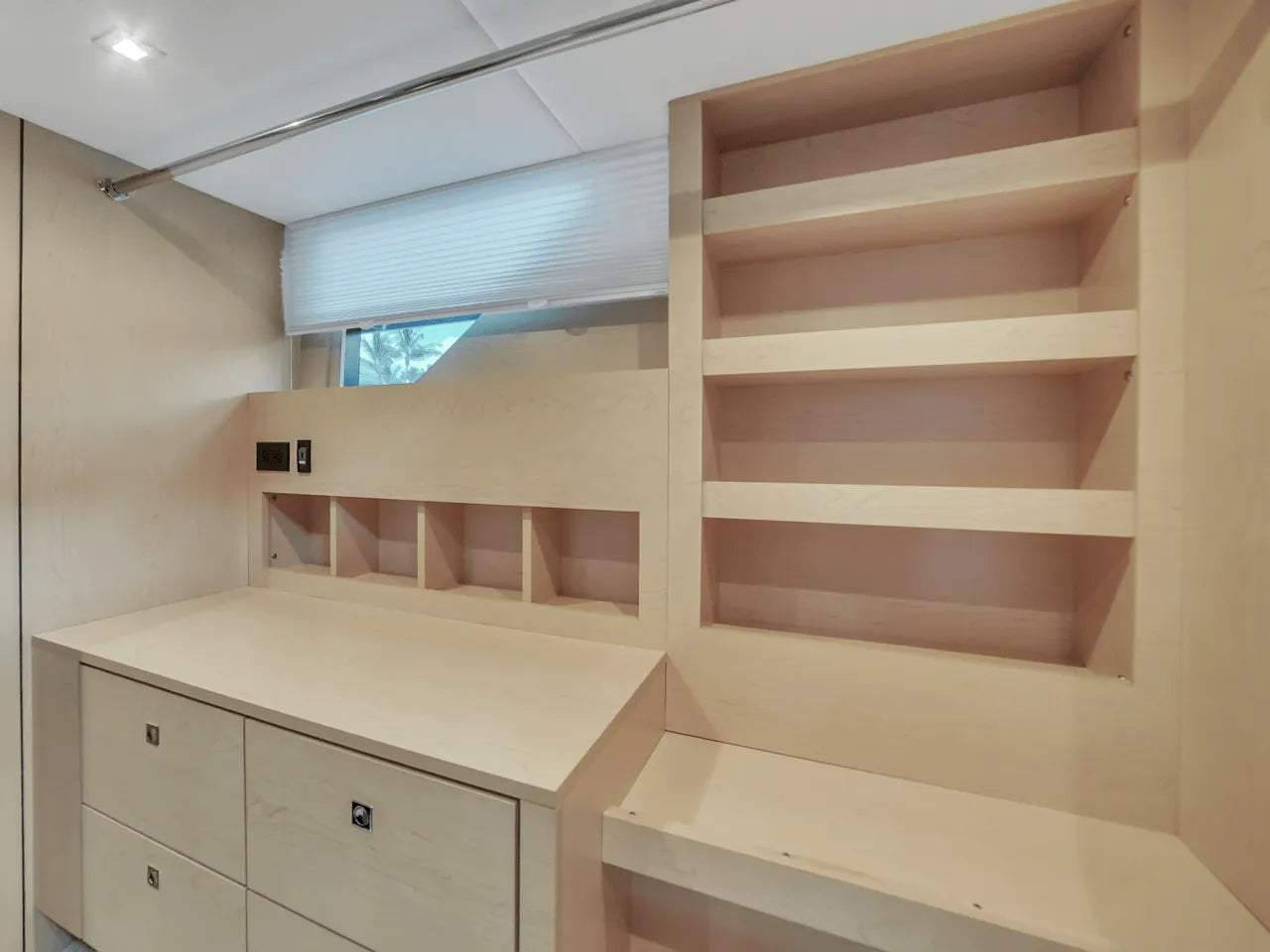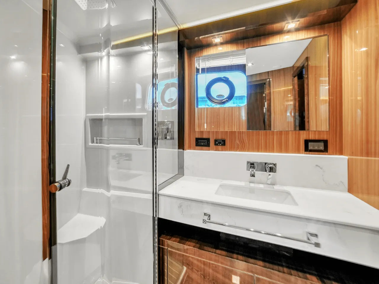 Inside, the bright salon flows seamlessly into the aft galley, which is fully equipped with high-end appliances. The full-beam master stateroom features a king berth, walk-in closet, and waterfall shower, complemented by a VIP stateroom and optional third guest cabin. Powered by twin Volvo IPS 950s, the 60 Fly cruises comfortably in the low 20-knot range with a top speed of 32 knots, offering a perfect balance of performance and luxury.