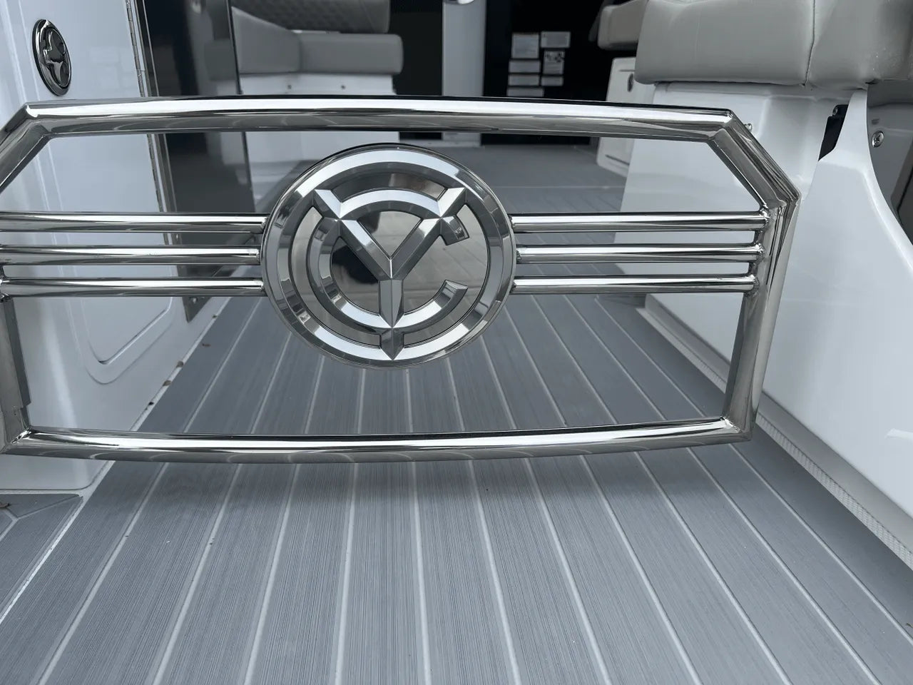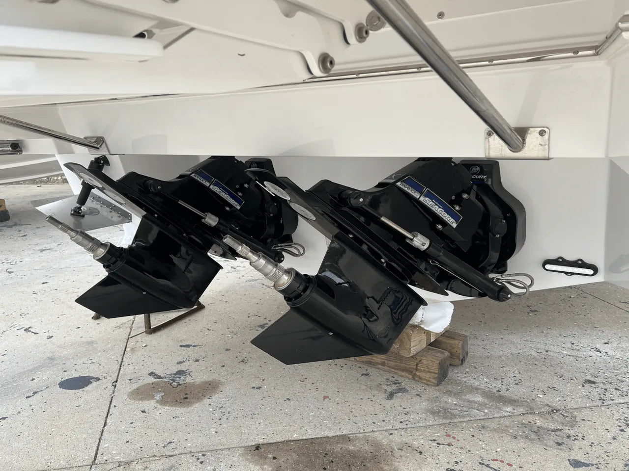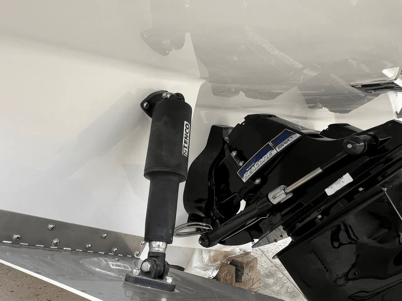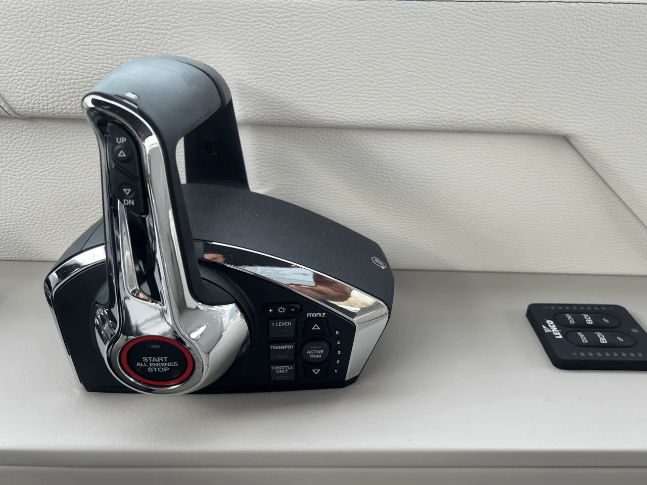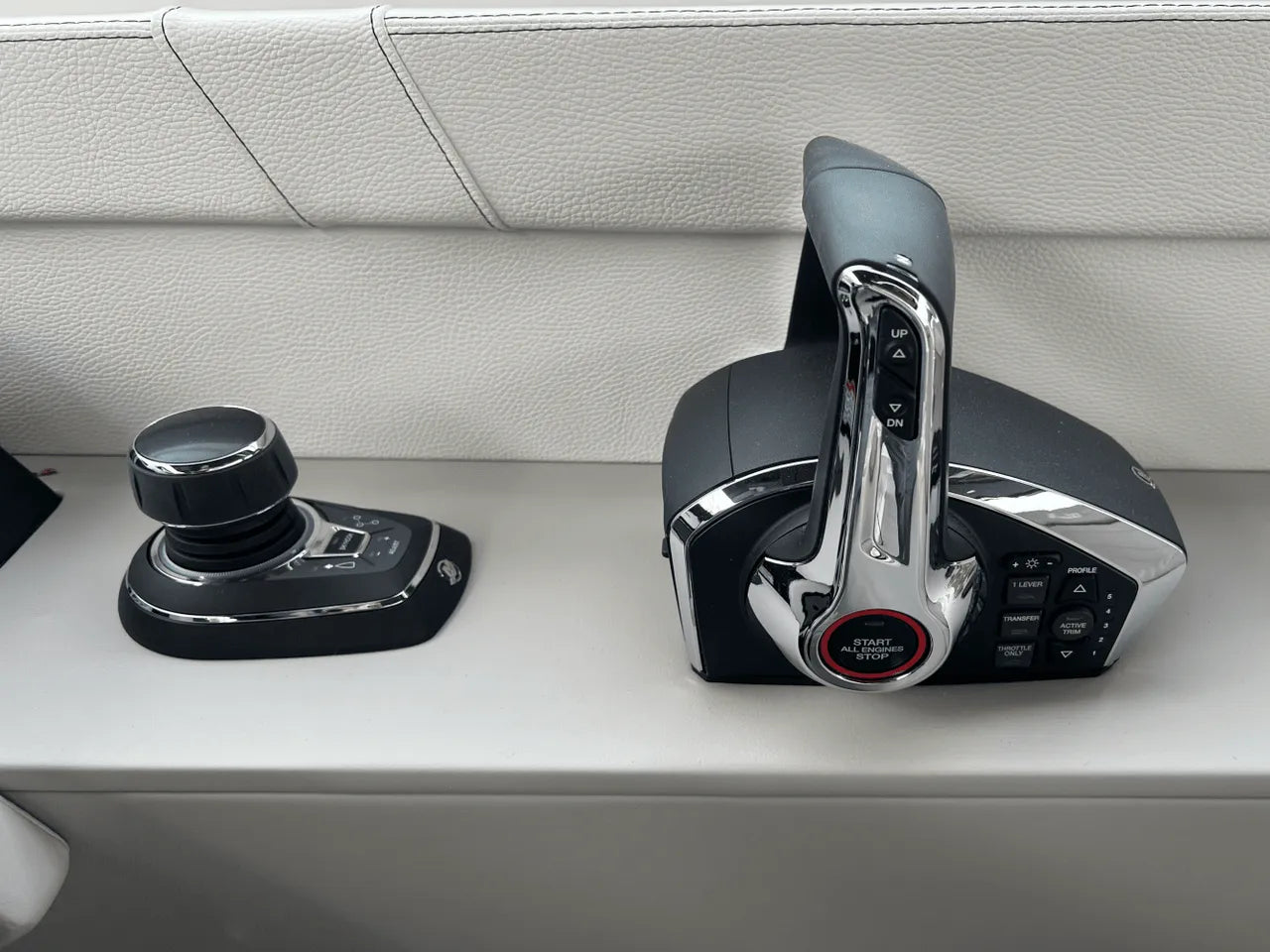 - Exceptional Power & Control: This vessel is equipped with twin MerCruiser 8.2 MAG 380 HP inboard/outboard engines with Bravo III drives. This high-performance setup provides a combined 760 HP, ensuring exhilarating top-end speed and a smooth, powerful ride. The Axius joystick system with Digital Throttle and Shift (DTS) offers intuitive and precise control, making docking and low-speed maneuvering effortless.