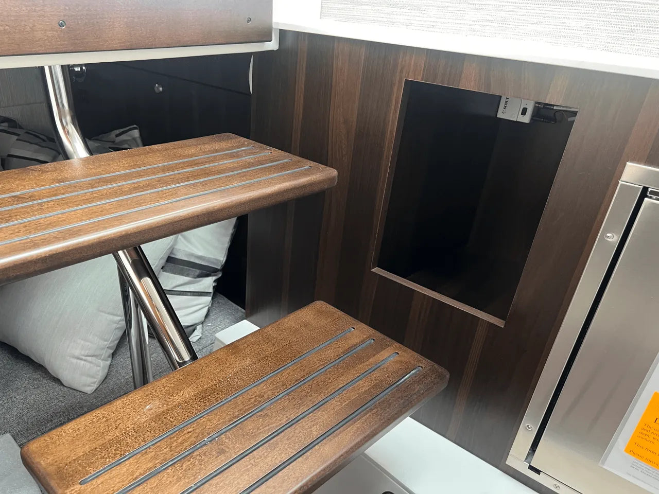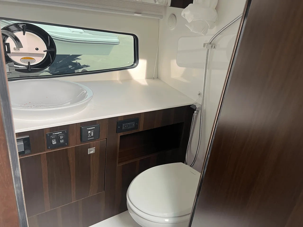 - Luxurious Cabin: Below deck, a beautifully appointed cabin offers a private retreat with an aft stateroom and a dinette that converts into a spacious berth. The cabin is complete with a microwave, refrigerator, and a fully equipped head with a sink, toilet, and a standing shower.