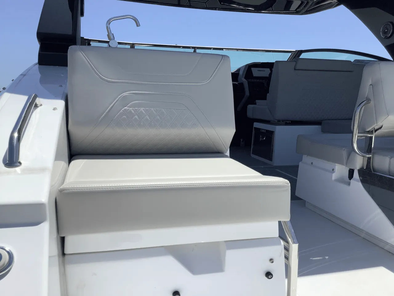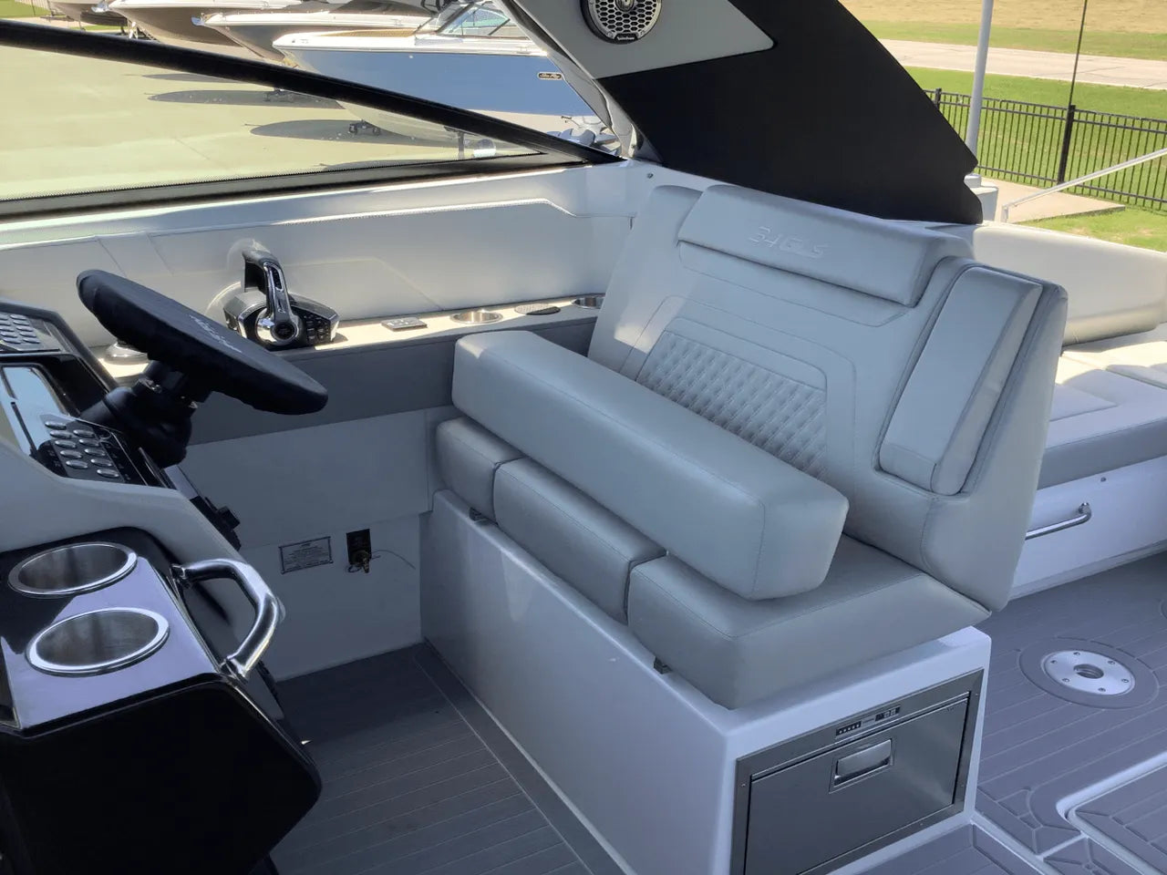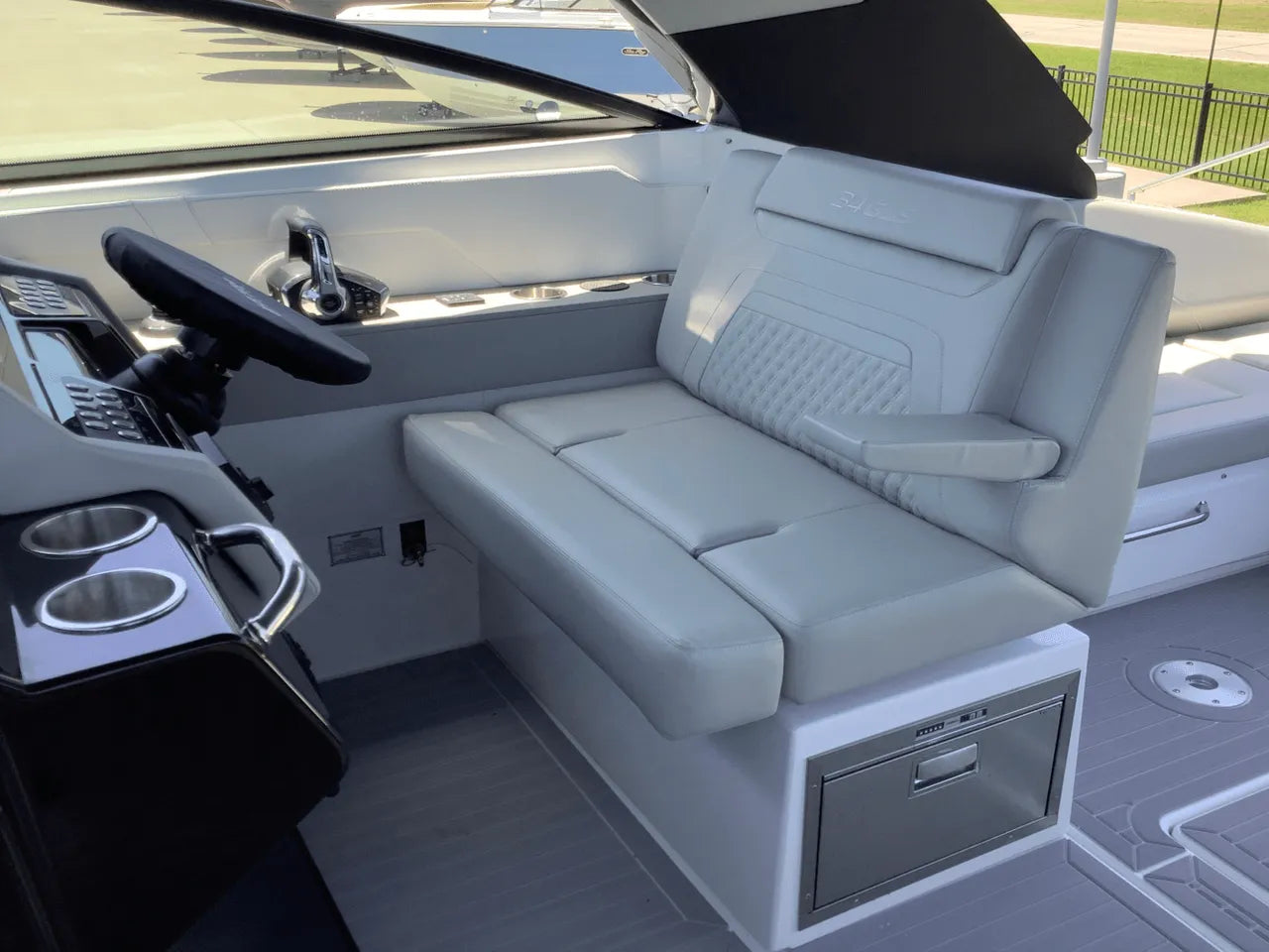 - Advanced Helm & Technology: The helm is impeccably designed with dual Simrad electronics and joystick piloting. Other features include a conductive phone charging pad, integrated audio, and optional helm air conditioning, ensuring the captain stays comfortable and in control.
