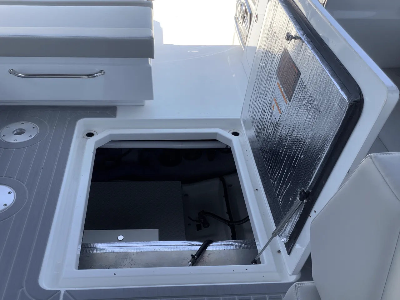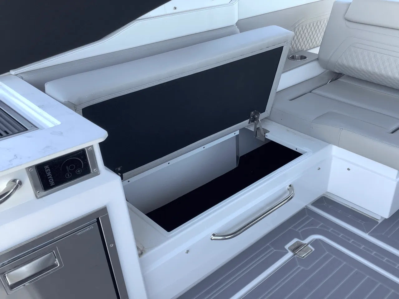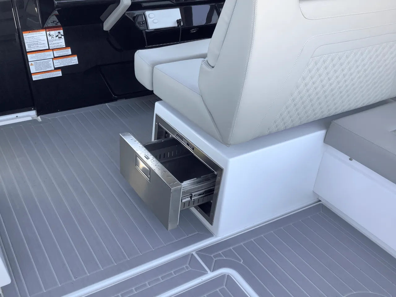 - Advanced Helm & Technology: The helm is impeccably designed with dual Simrad electronics and joystick piloting. Other features include a conductive phone charging pad, integrated audio, and optional helm air conditioning, ensuring the captain stays comfortable and in control.