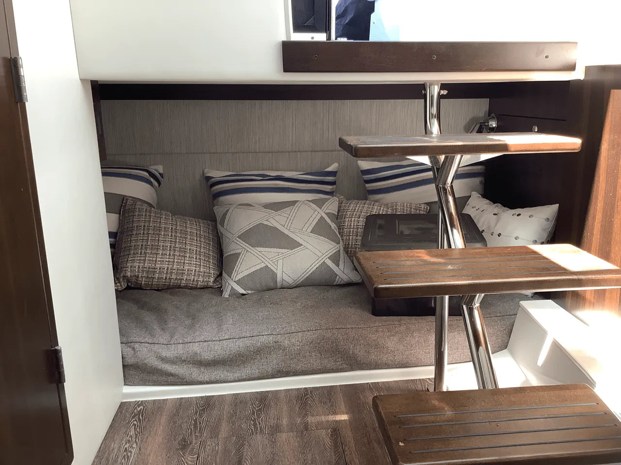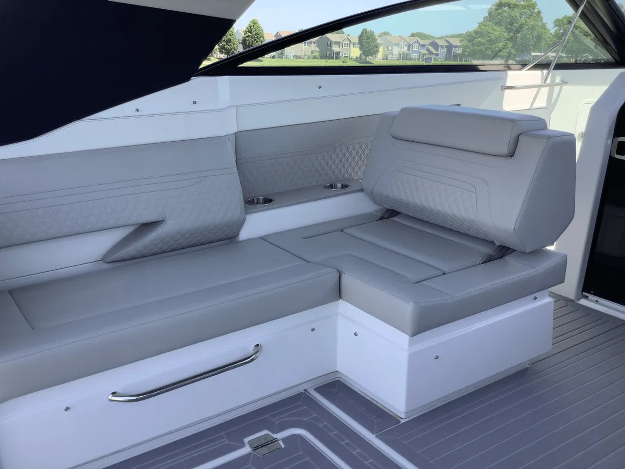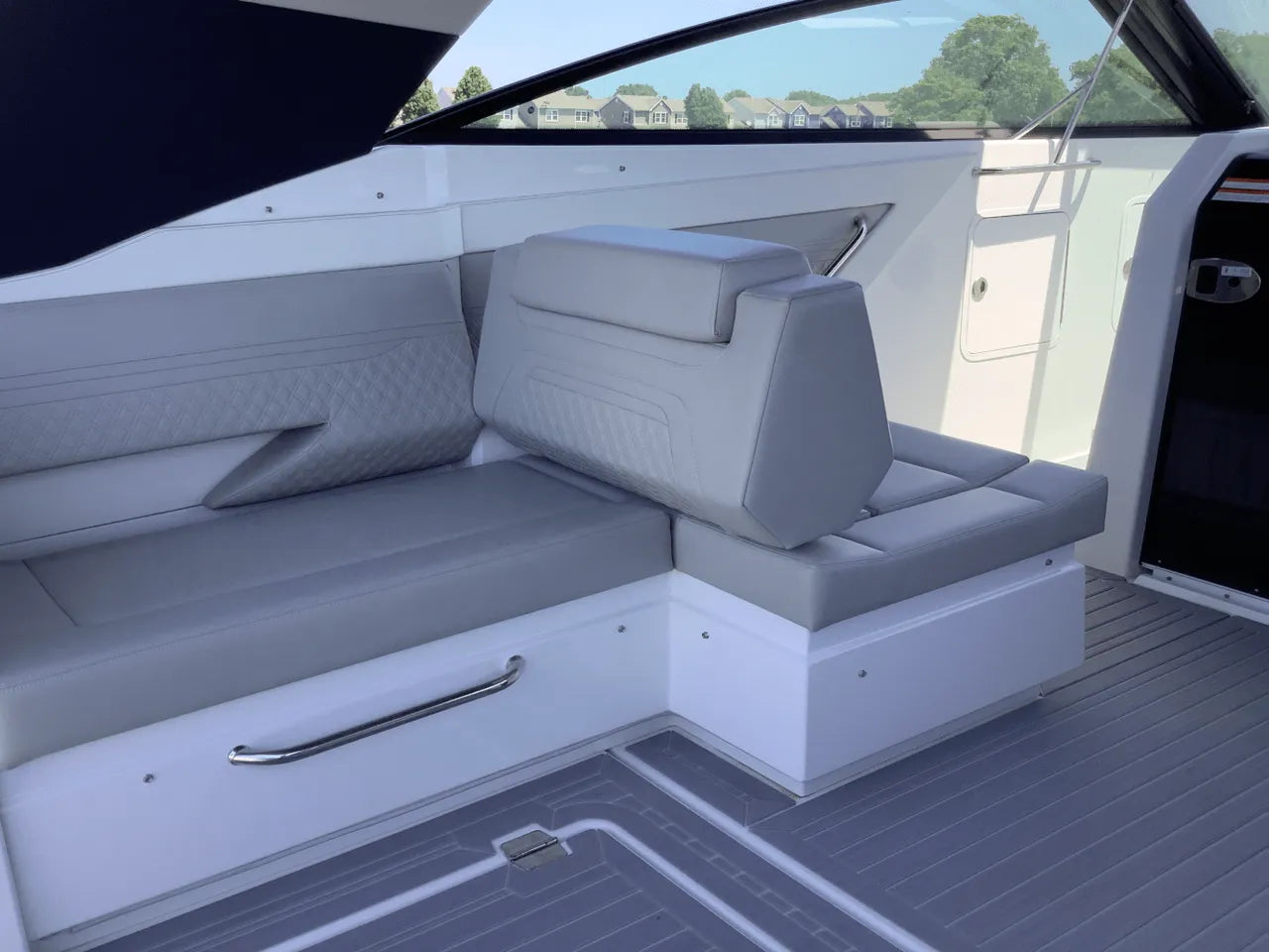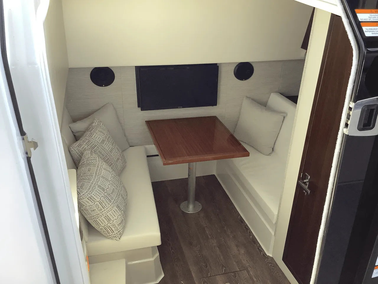 - Comfortable Lower Cabin: Below deck, the salon offers a sanctuary from the sun. It features an aft stateroom with a custom-sized berth and a U-shaped dinette that converts into a spacious berth, providing comfortable overnight accommodations for a weekend on the lake.