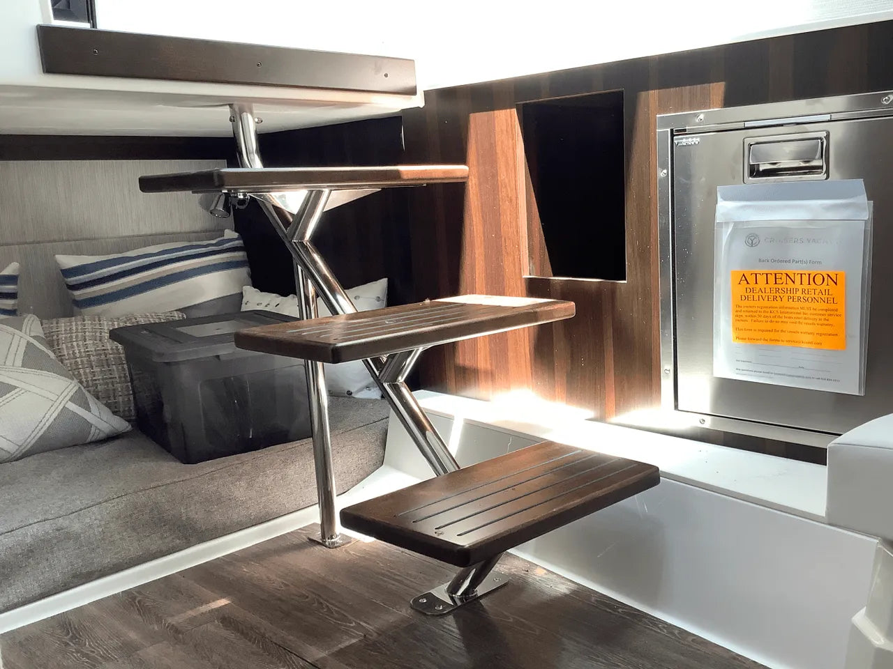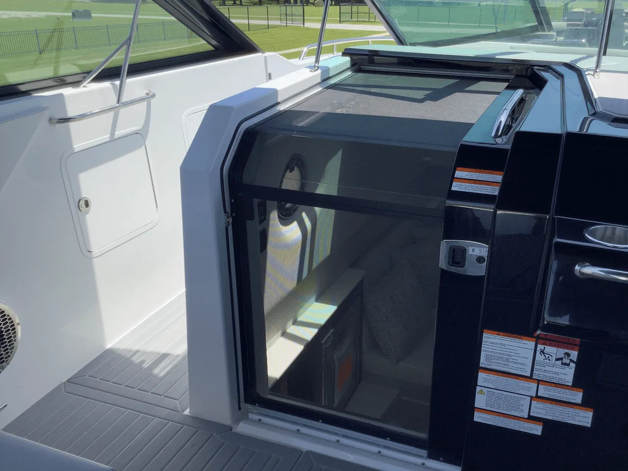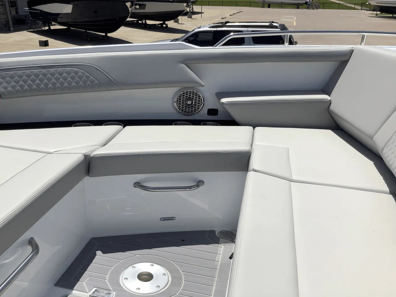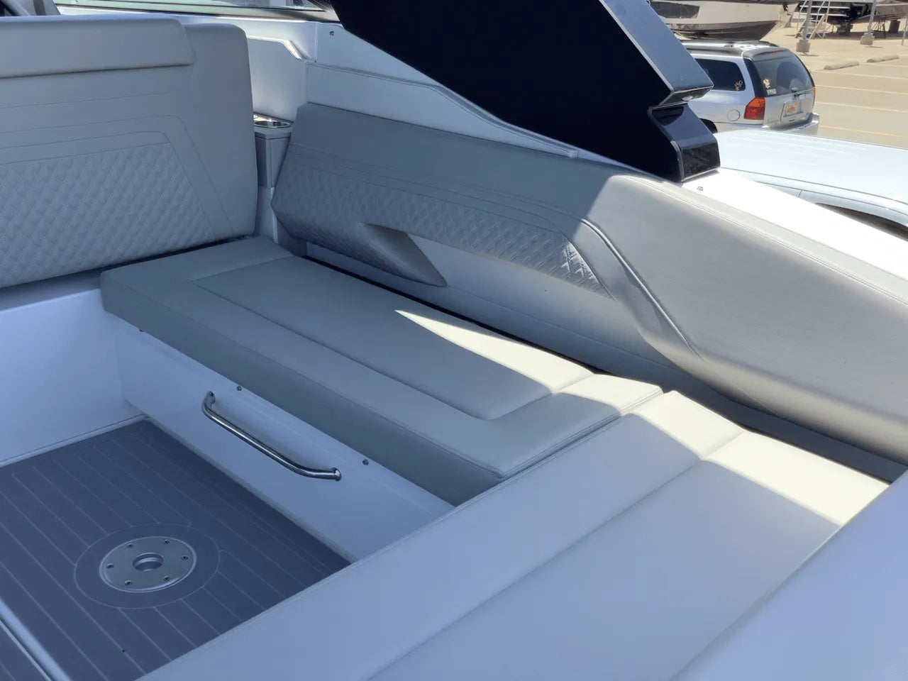 - Comfortable Lower Cabin: Below deck, the salon offers a sanctuary from the sun. It features an aft stateroom with a custom-sized berth and a U-shaped dinette that converts into a spacious berth, providing comfortable overnight accommodations for a weekend on the lake.