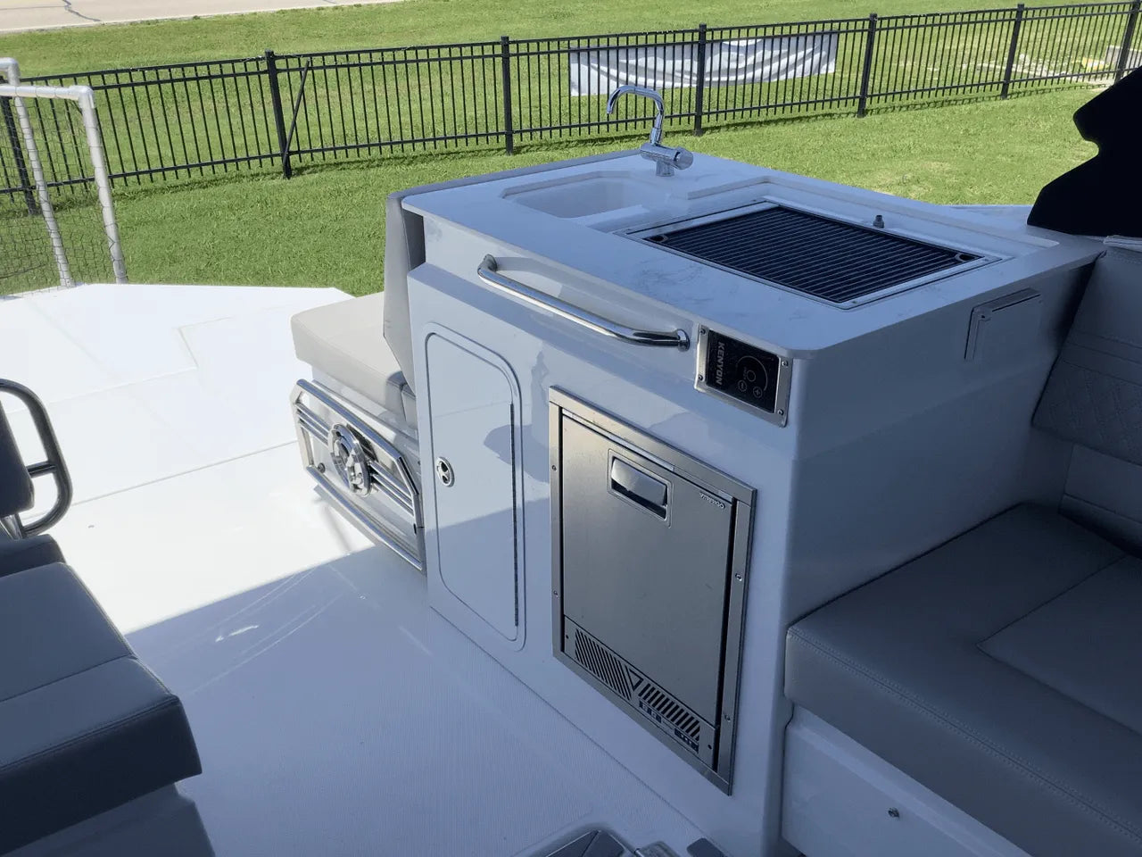 - Full-Featured Galley & Head: The cockpit galley includes a refrigerator, sink, and storage, with an optional grill available. The lower cabin also features a galley with a microwave and a full standing head with a shower, providing all the comforts of home.