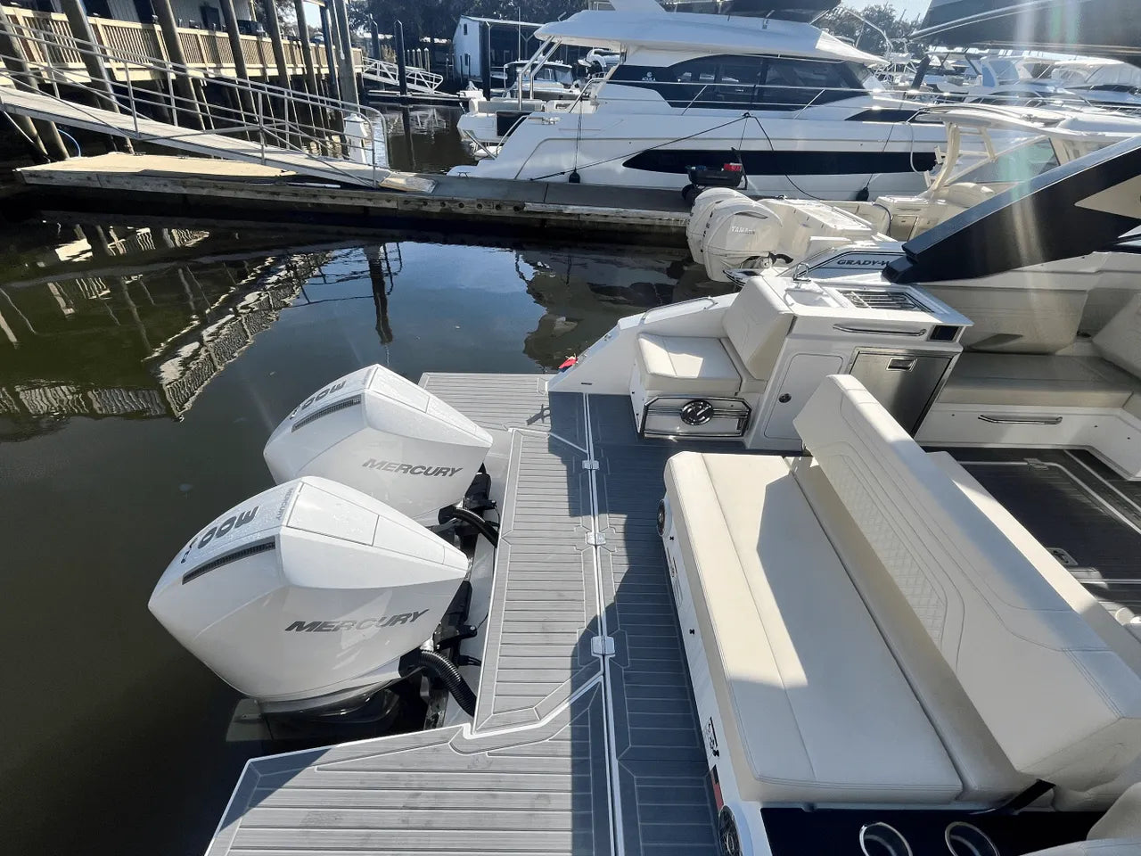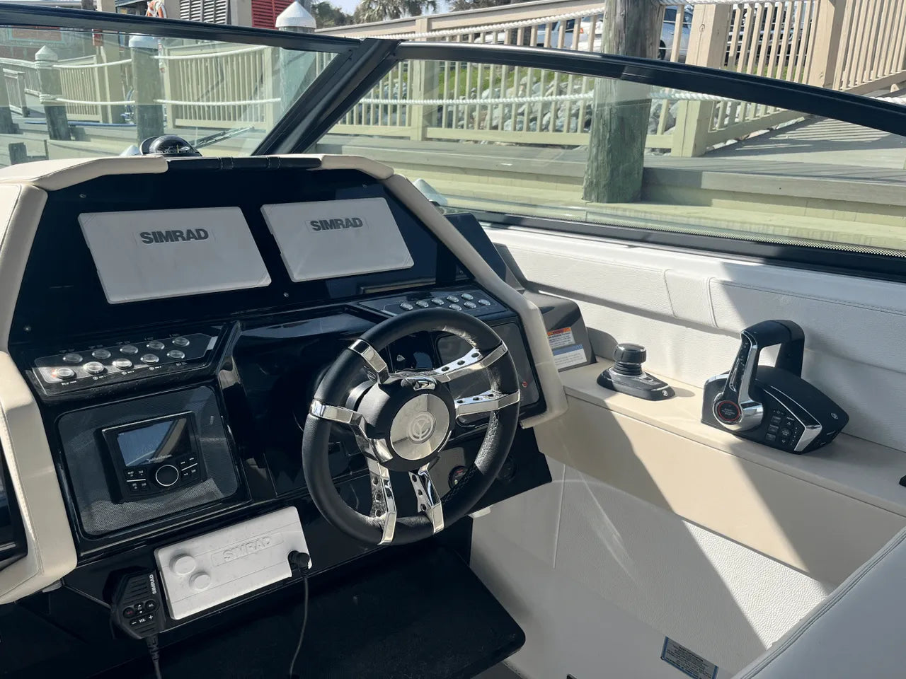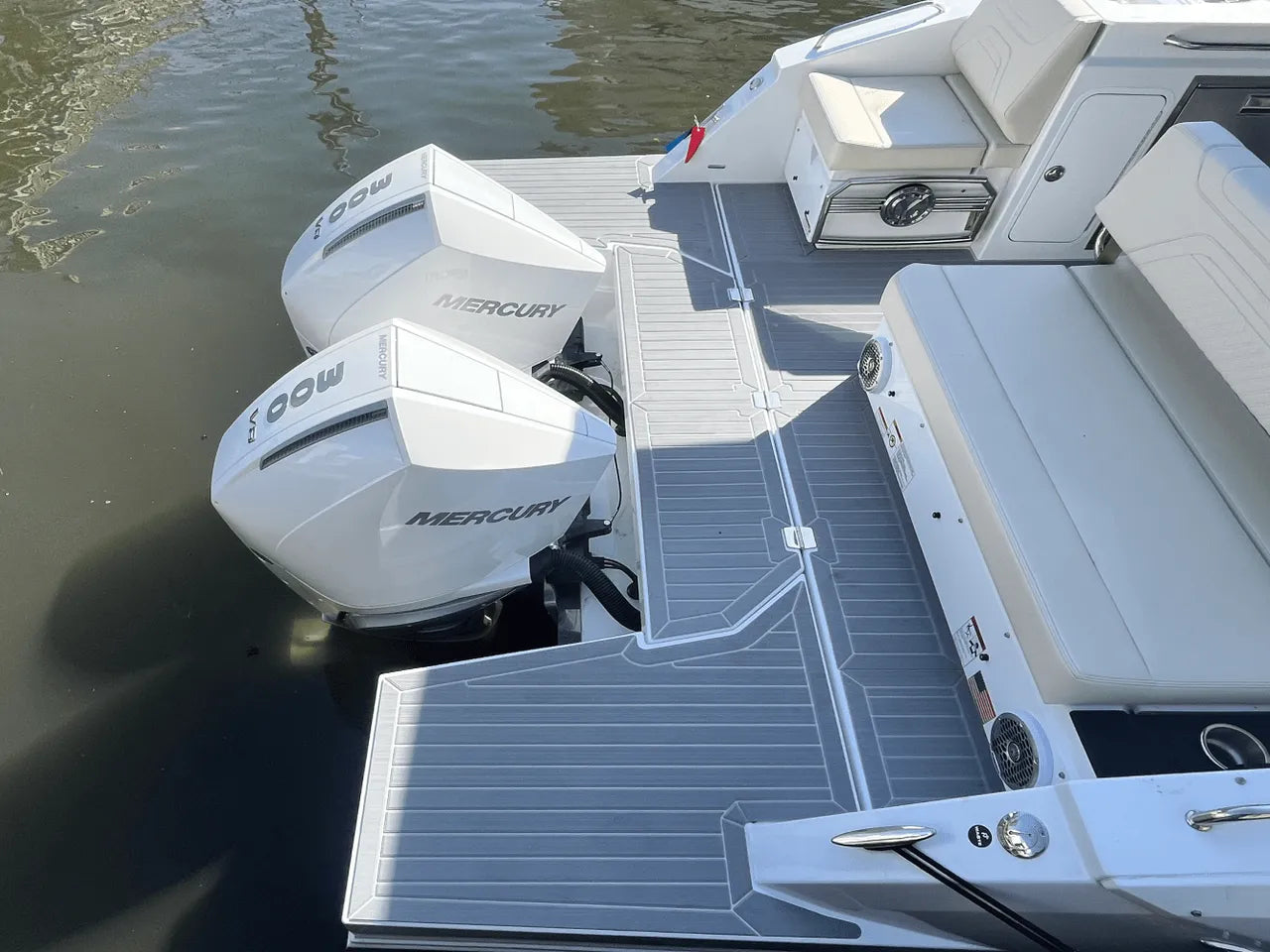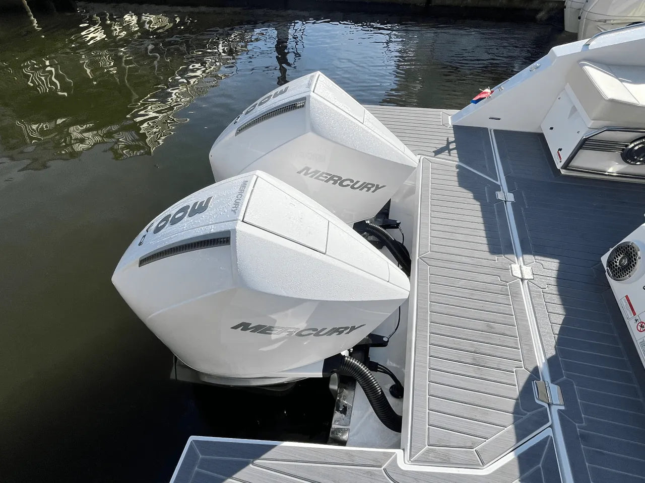 - Exceptional Power & Control: This vessel is equipped with twin White Mercury 300 HP Verado outboard engines with Joystick Piloting for Outboards (JPO). This high-performance setup provides a combined 600 HP for a smooth, powerful ride. The Joystick Piloting system offers intuitive and precise control, making docking and low-speed maneuvering effortless. The Reverso Engine Flush System adds convenience for outboard maintenance.