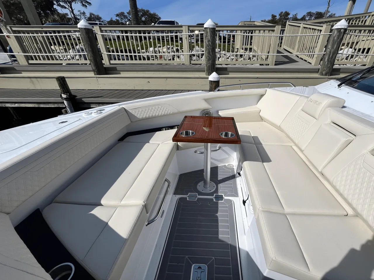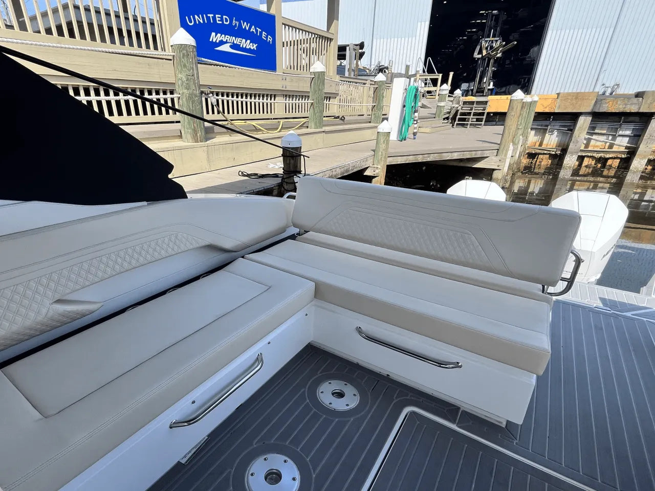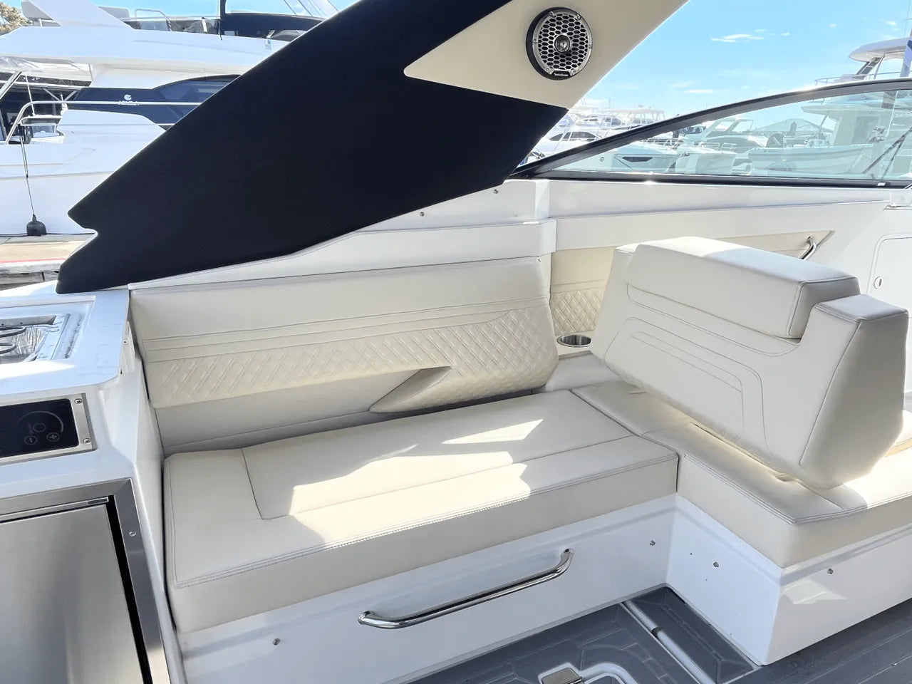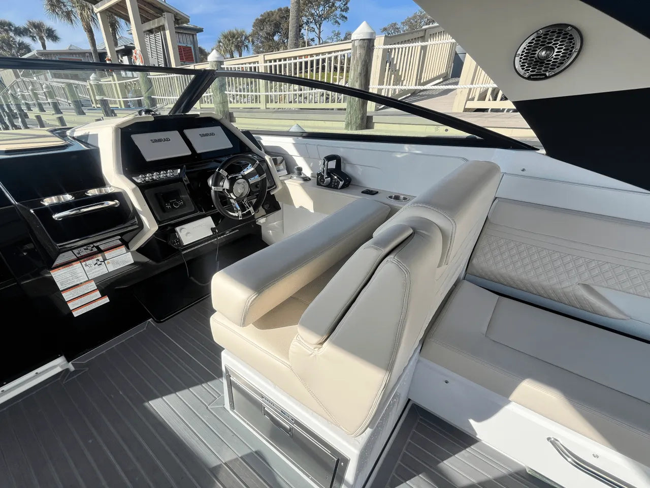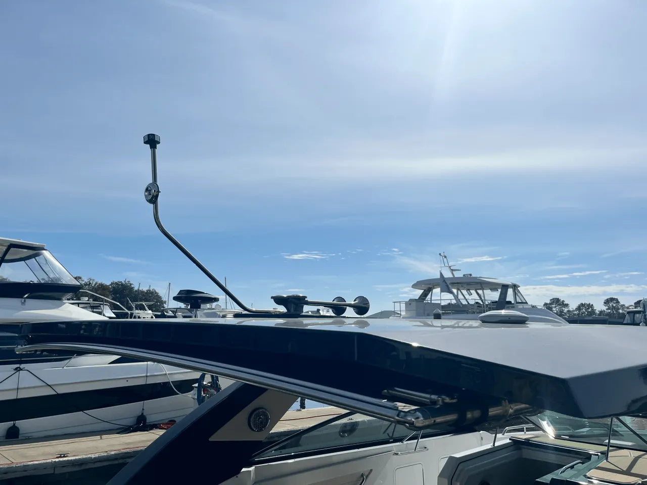 - Luxury & Comfort: The boat features a sleek Black Hardtop with a Retractable Cockpit Shade and a separate Foredeck Shade for ample sun protection. The Sand Ultraleather Cockpit Seating adds a luxurious touch, while the Gray SeaDek flooring in the cockpit and bow provides both comfort and style. The two 120V Helm Seat Refrigerators and Fresh Water Cockpit Washdown System add great convenience for entertaining.