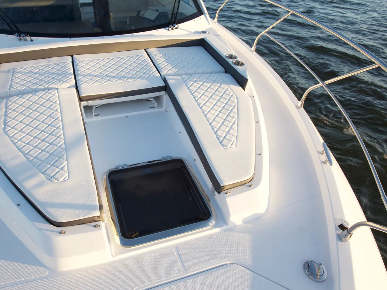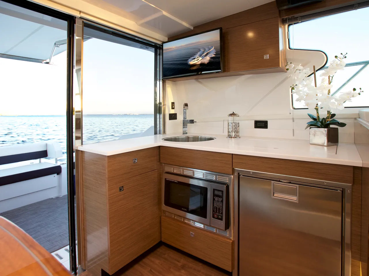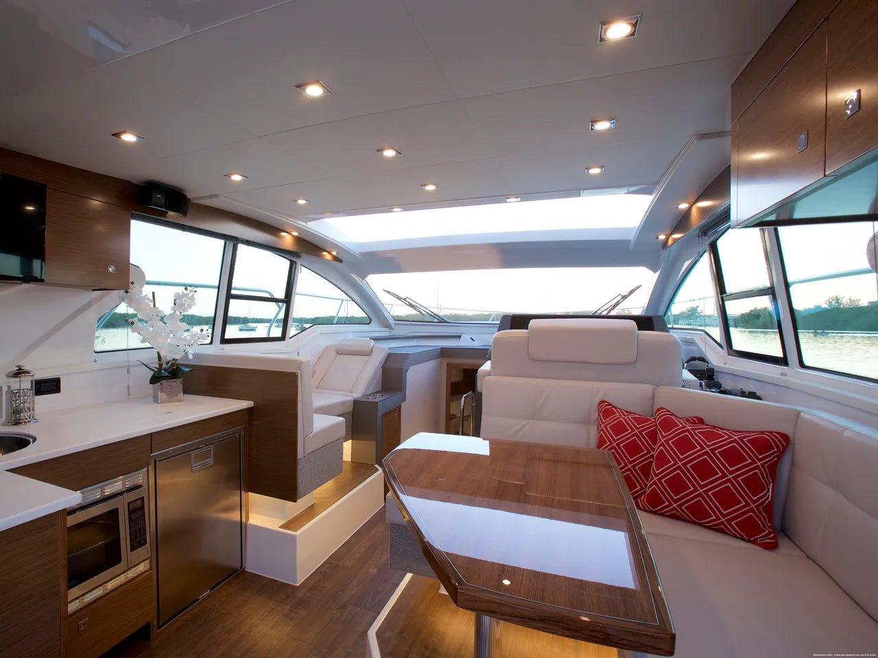 The Cantius Series from Cruisers Yachts encompasses everything a boater could want on the water with luxe accommodations and immaculate attention to detail. With 360 degree windows and an open-plan main deck that offers outdoor fun and protection from the elements, the 42 Cantius does it all. Command your 42 Cantius with a revolutionary helm. Cruiser with advanced technology, carefully engineered controls, and smart layout. Large windows and the retractable sunroof lets you breathe in the sea air and enjoy the views from the comfort of the interior couch.