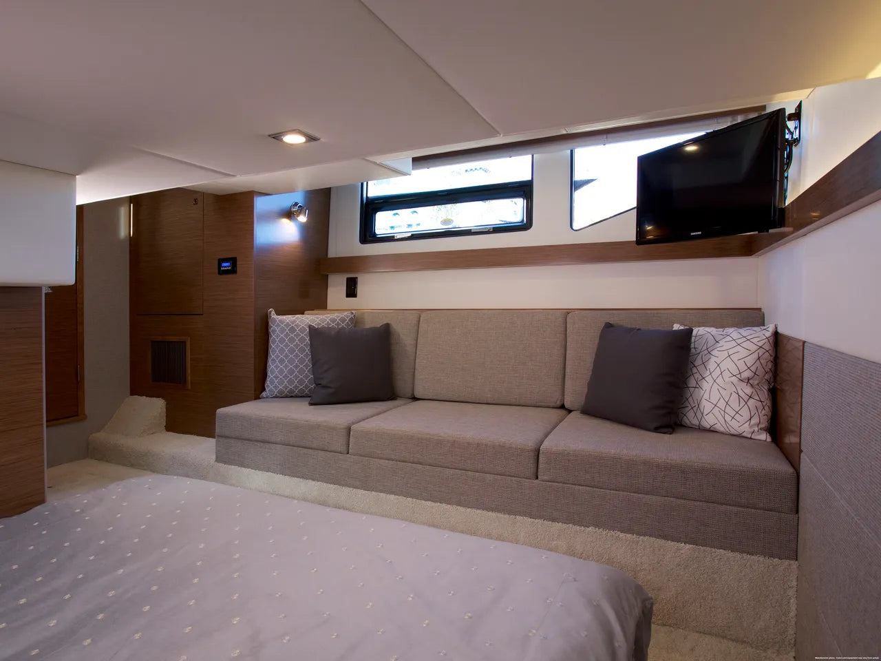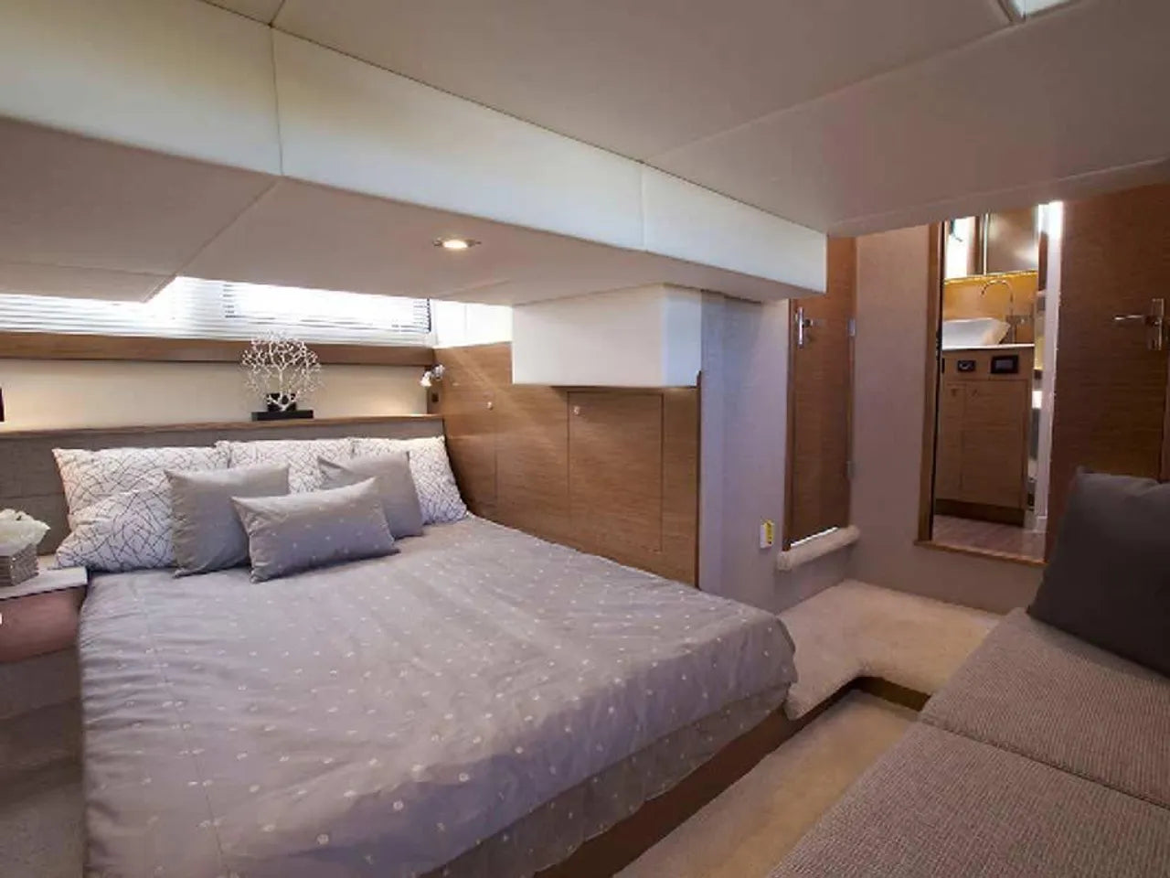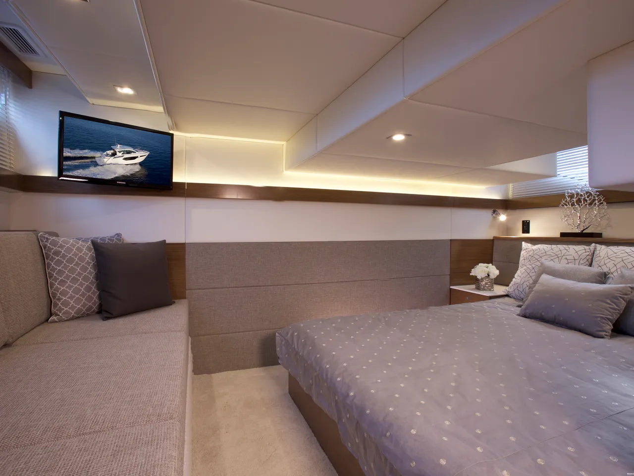 The Cantius Series from Cruisers Yachts encompasses everything a boater could want on the water with luxe accommodations and immaculate attention to detail. With 360 degree windows and an open-plan main deck that offers outdoor fun and protection from the elements, the 42 Cantius does it all. Command your 42 Cantius with a revolutionary helm. Cruiser with advanced technology, carefully engineered controls, and smart layout. Large windows and the retractable sunroof lets you breathe in the sea air and enjoy the views from the comfort of the interior couch.