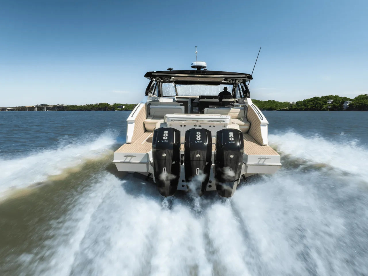 - Exceptional Performance: Propelled by triple Mercury 600 JPO V10 outboard engines, this yacht boasts a formidable 1800 horsepower, allowing it to reach impressive top speeds of up to 56 mph. The Joystick Piloting (JPO) system ensures effortless docking and precise maneuverability, even in challenging conditions.
