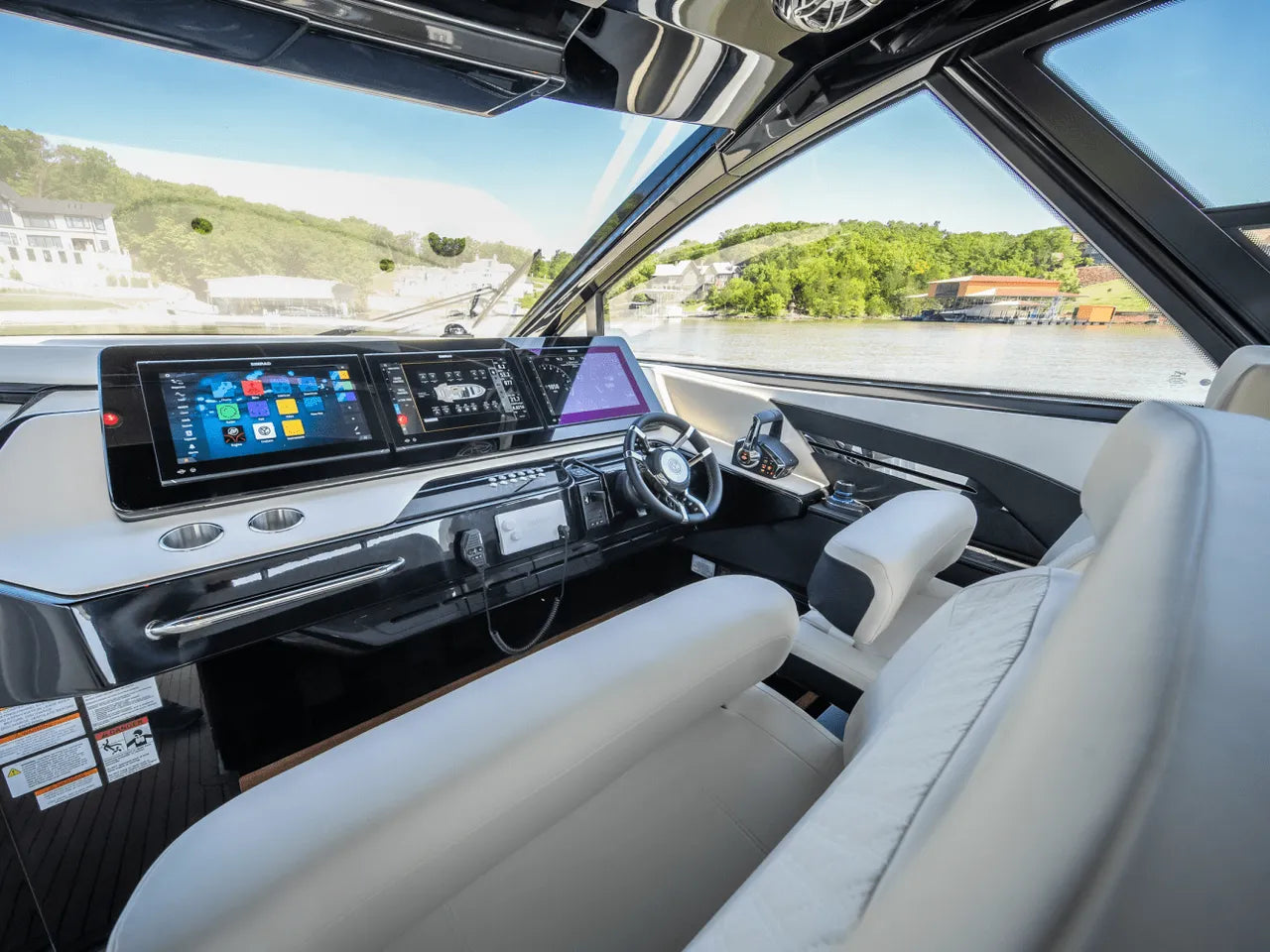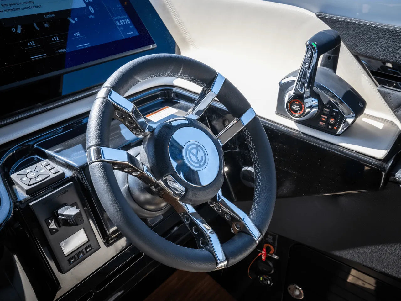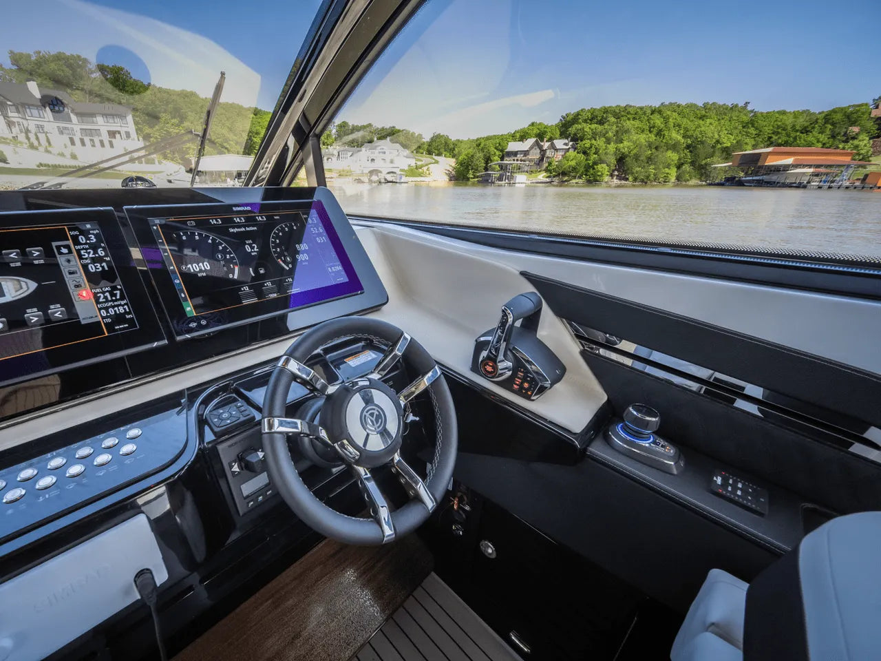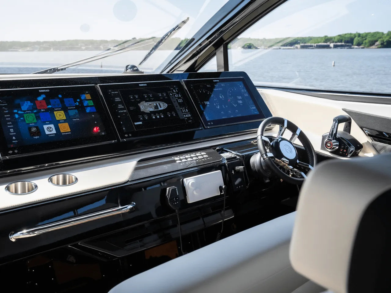 - Advanced Helm: The meticulously designed helm puts you in command with triple Simrad screens (including dual large 16-inch displays), electronic throttles, and joystick controls, all offering excellent visibility for confident navigation.