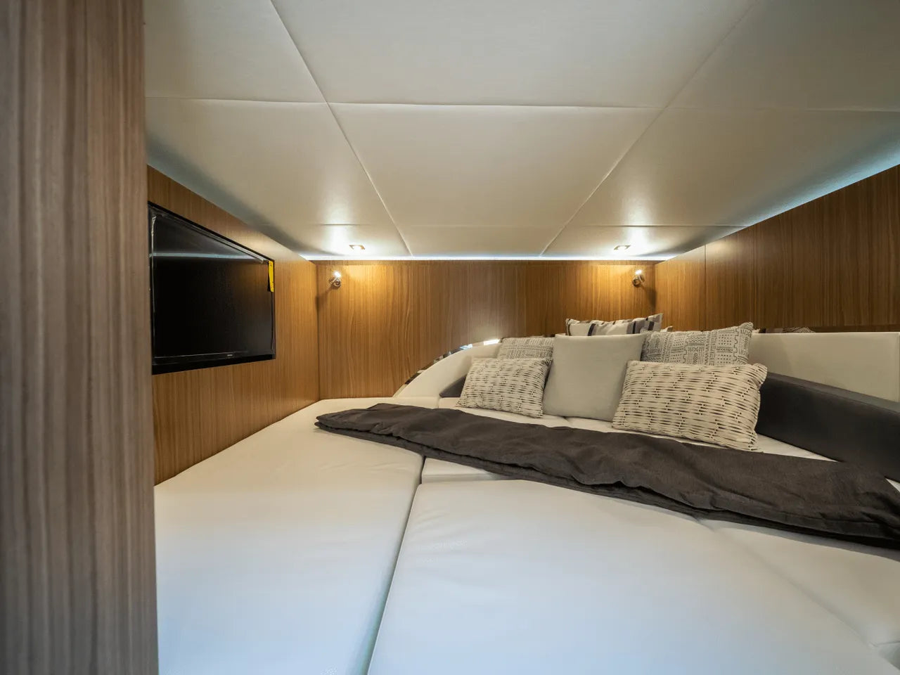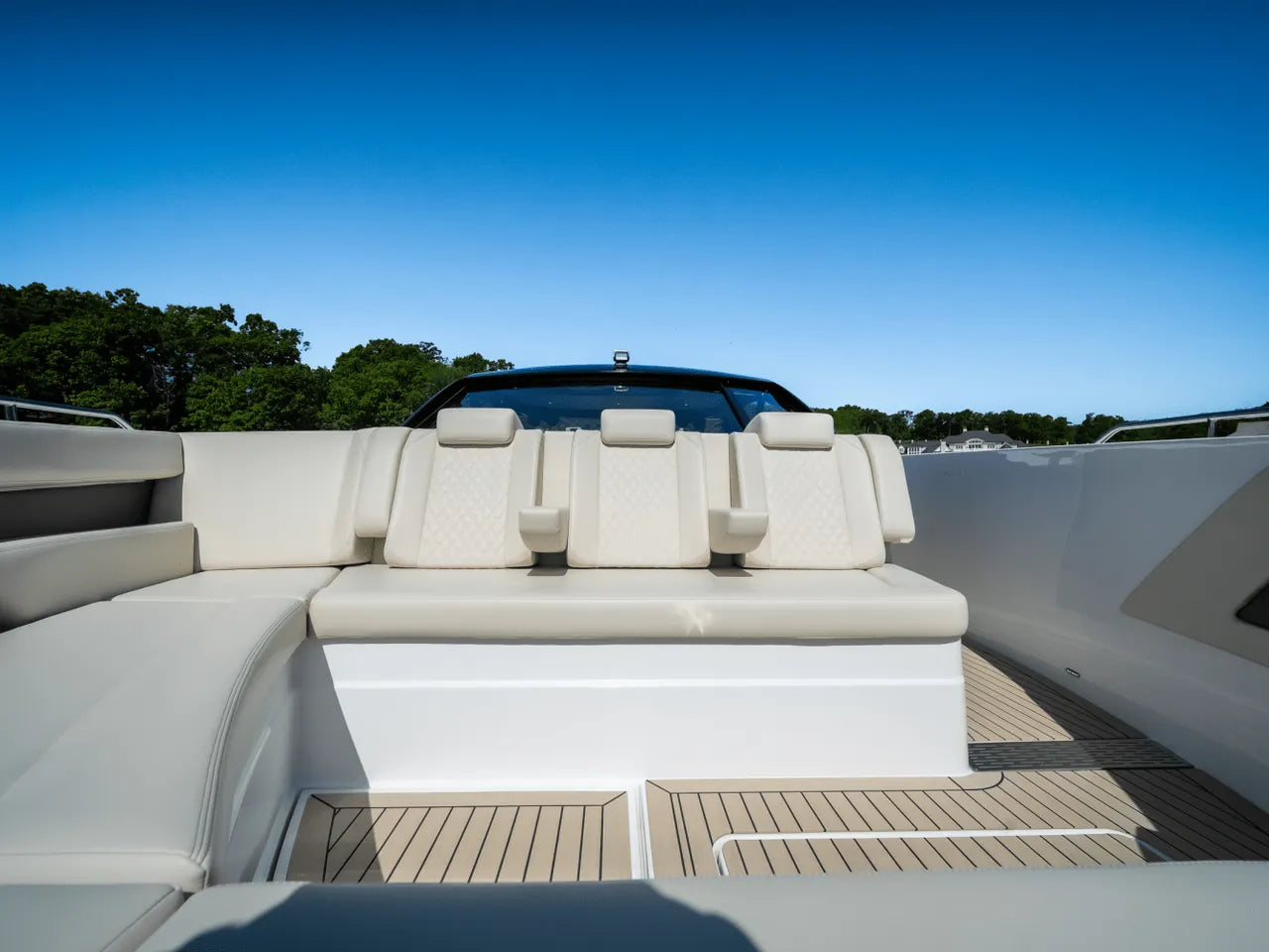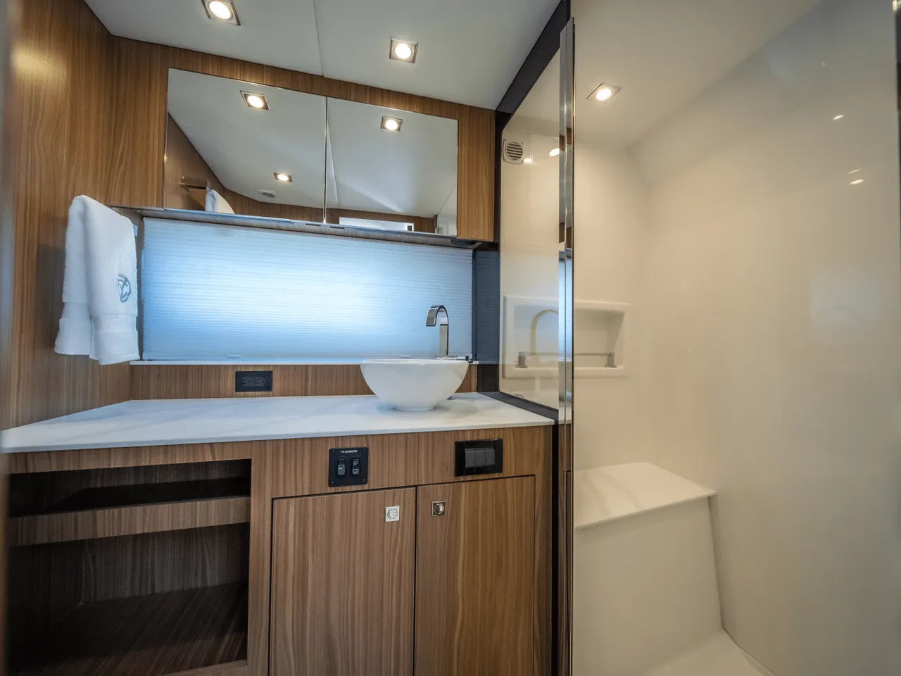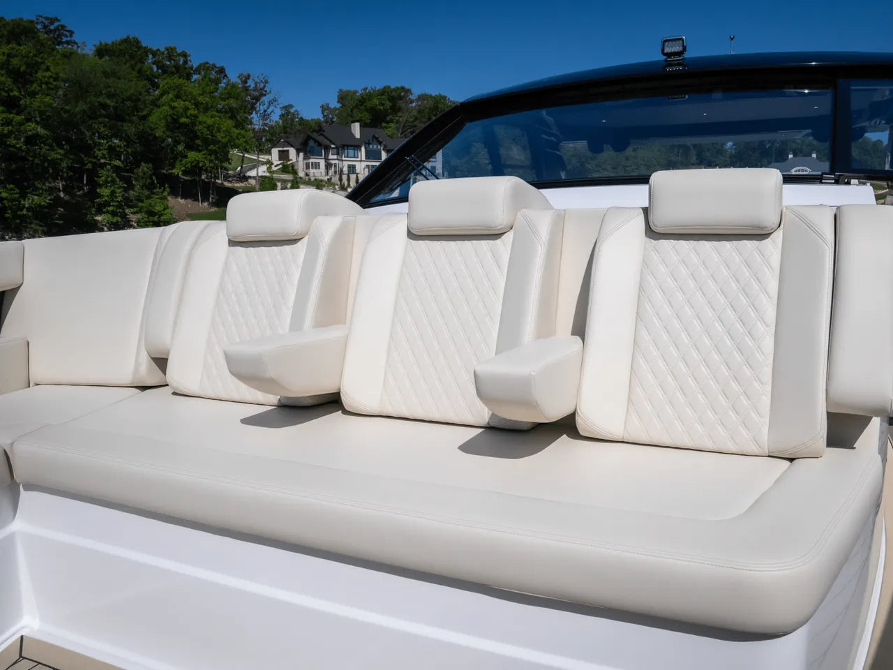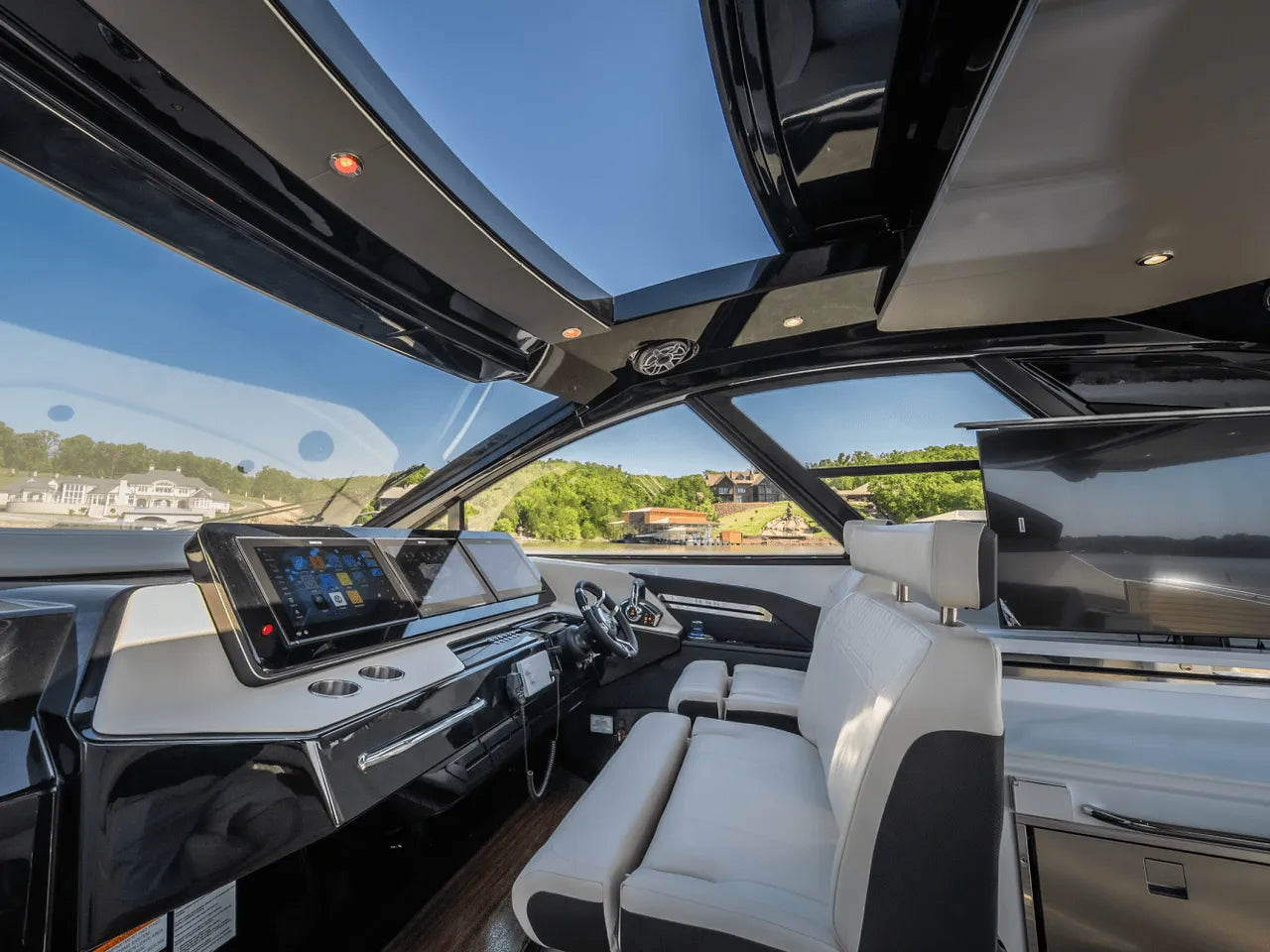 - Advanced Helm: The meticulously designed helm puts you in command with triple Simrad screens (including dual large 16-inch displays), electronic throttles, and joystick controls, all offering excellent visibility for confident navigation.