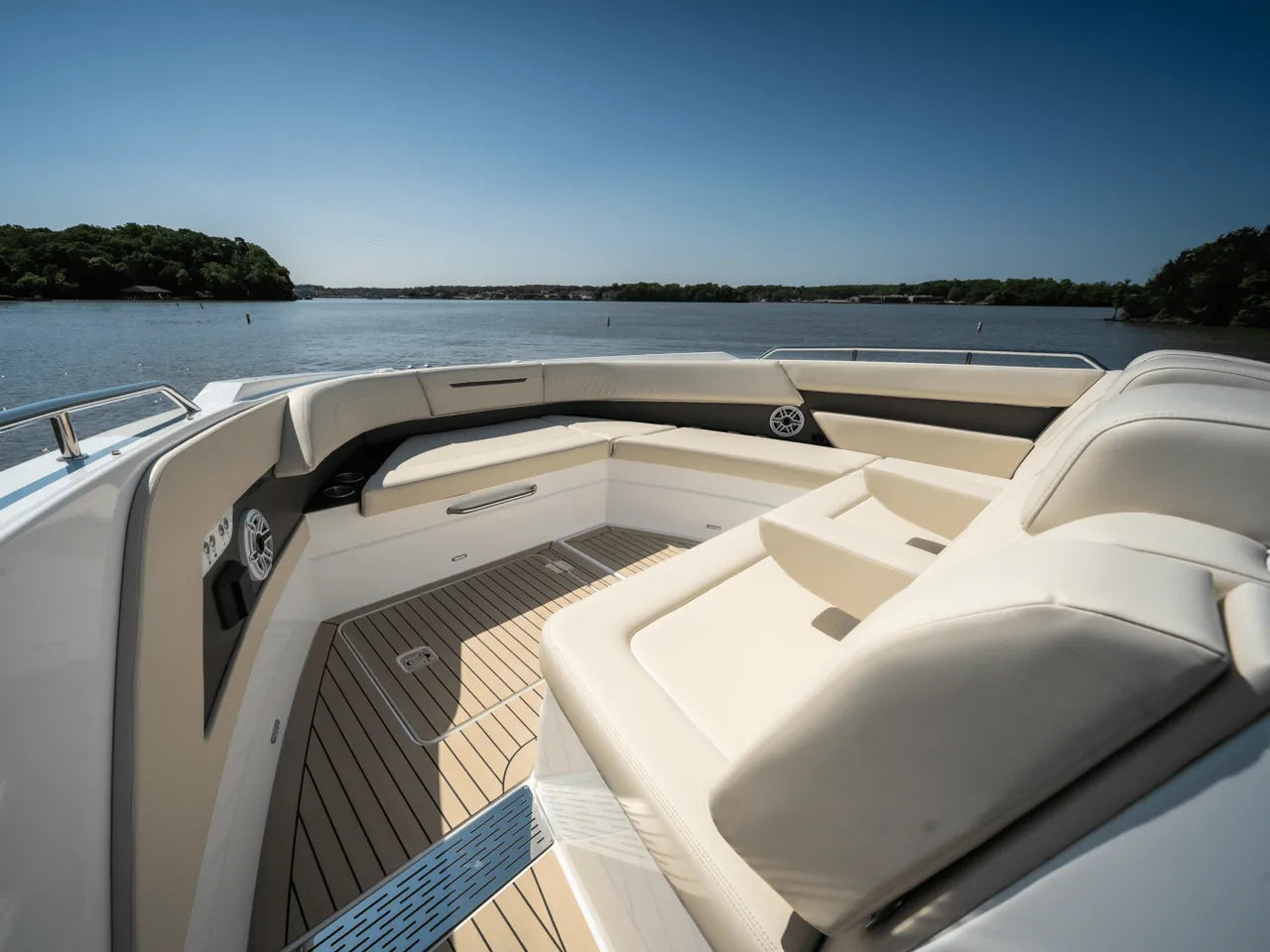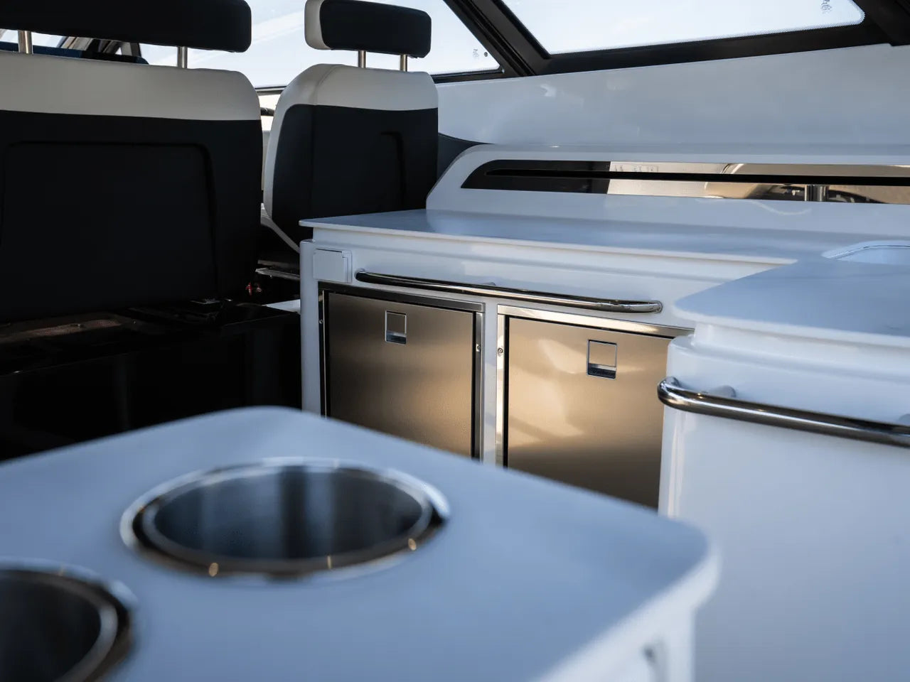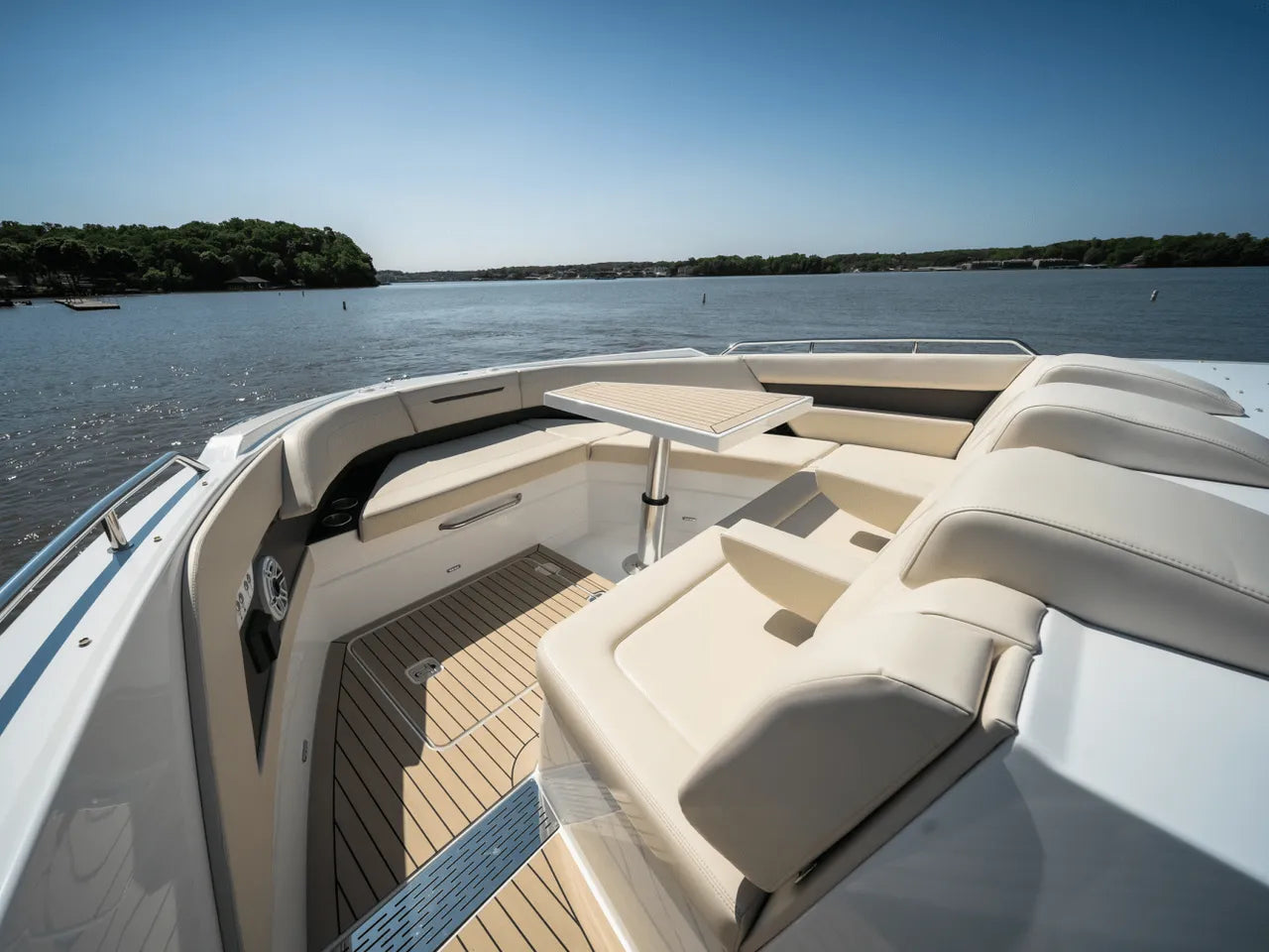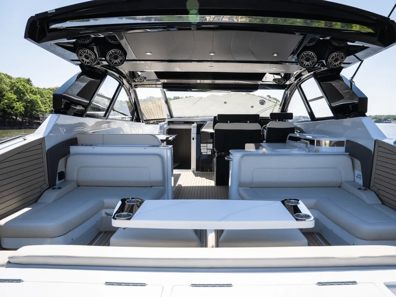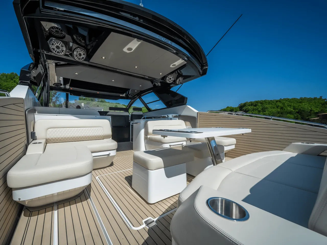 - Luxurious Bow Lounge: A powered door leads to a spacious and comfortable bow area, featuring a power high-low table, JL Audio speakers, a chiller box (no ice needed!), and integrated trash can. An optional foredeck shade offers respite from the sun.