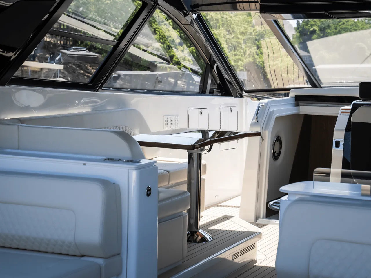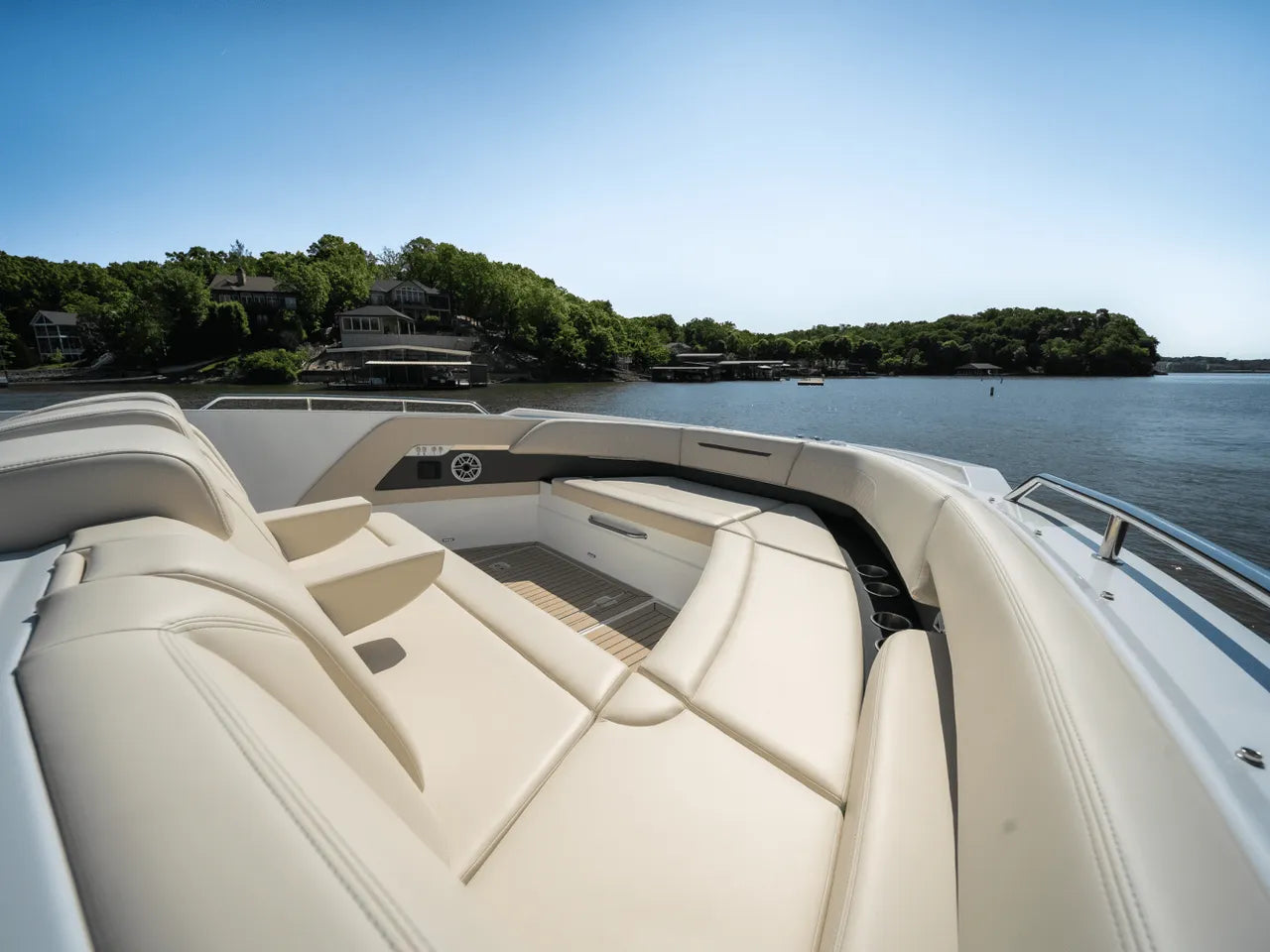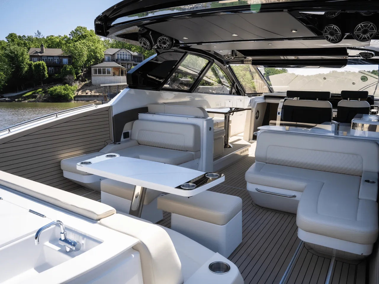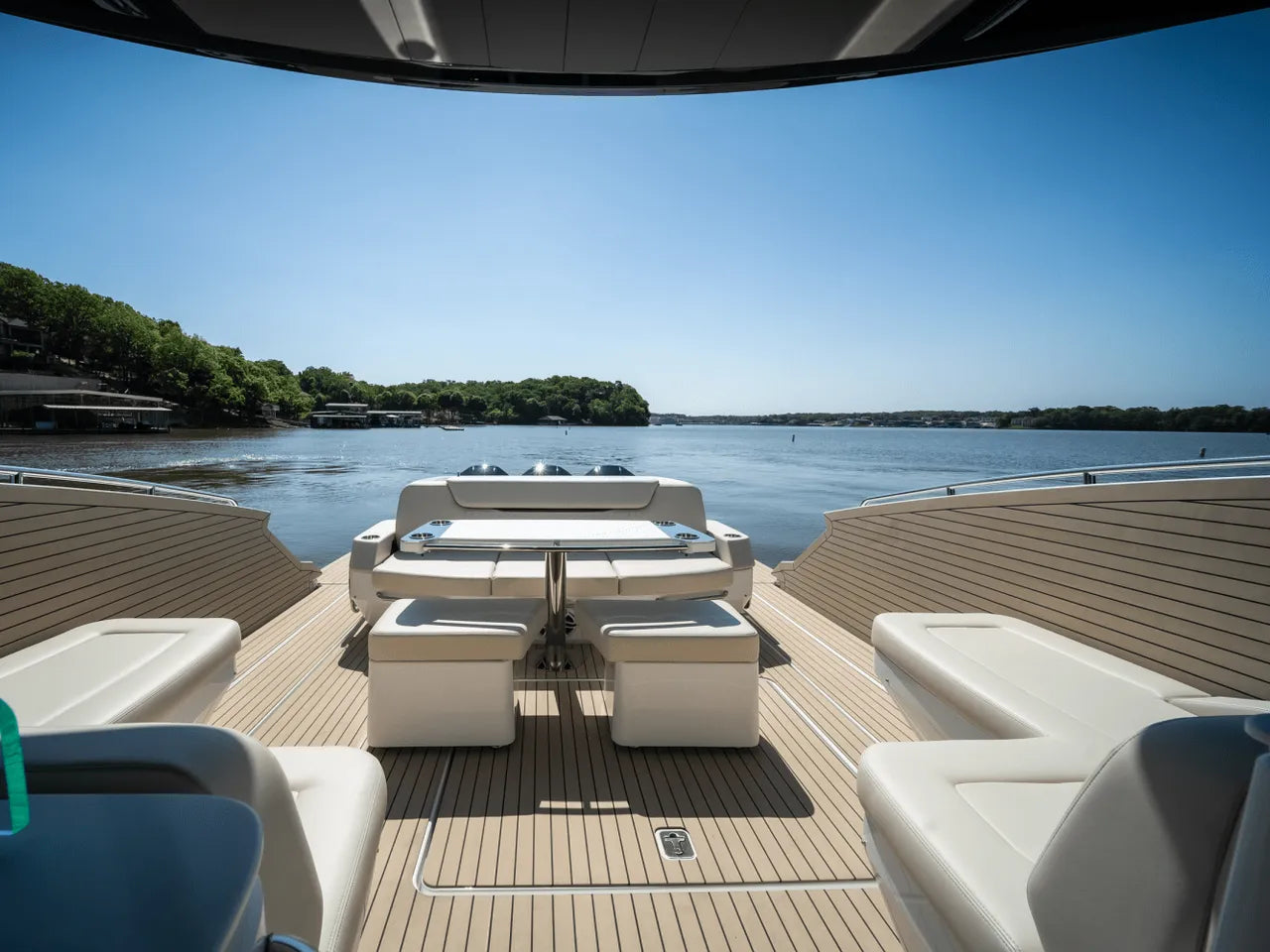 - Luxurious Bow Lounge: A powered door leads to a spacious and comfortable bow area, featuring a power high-low table, JL Audio speakers, a chiller box (no ice needed!), and integrated trash can. An optional foredeck shade offers respite from the sun.
