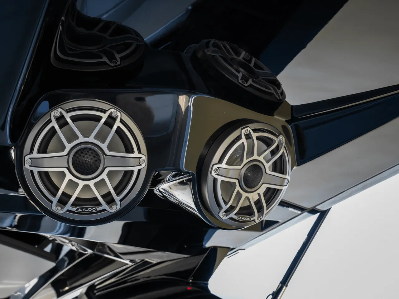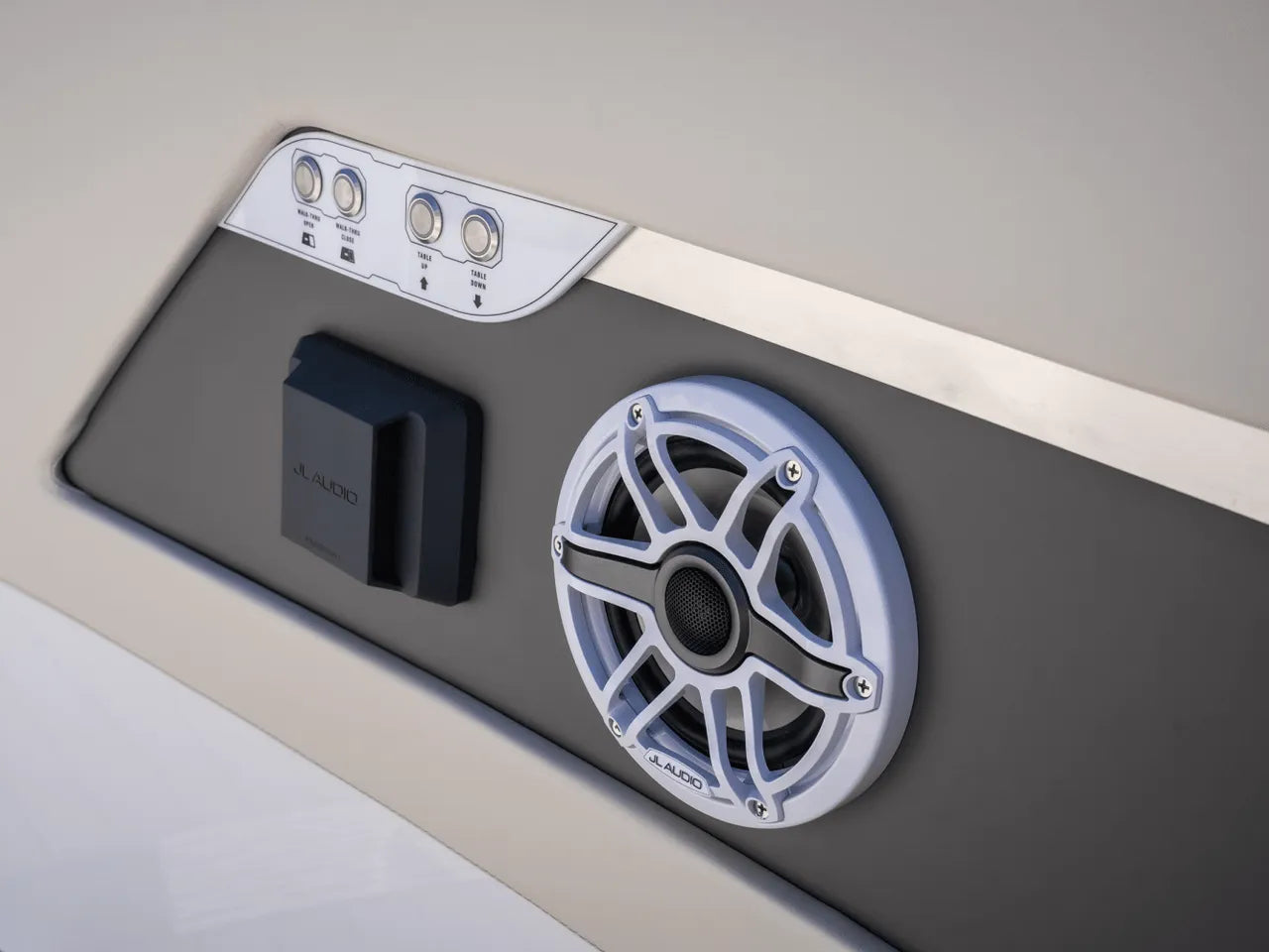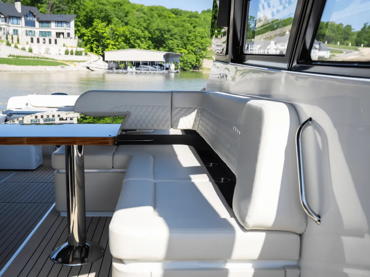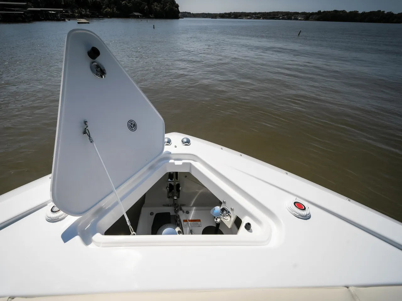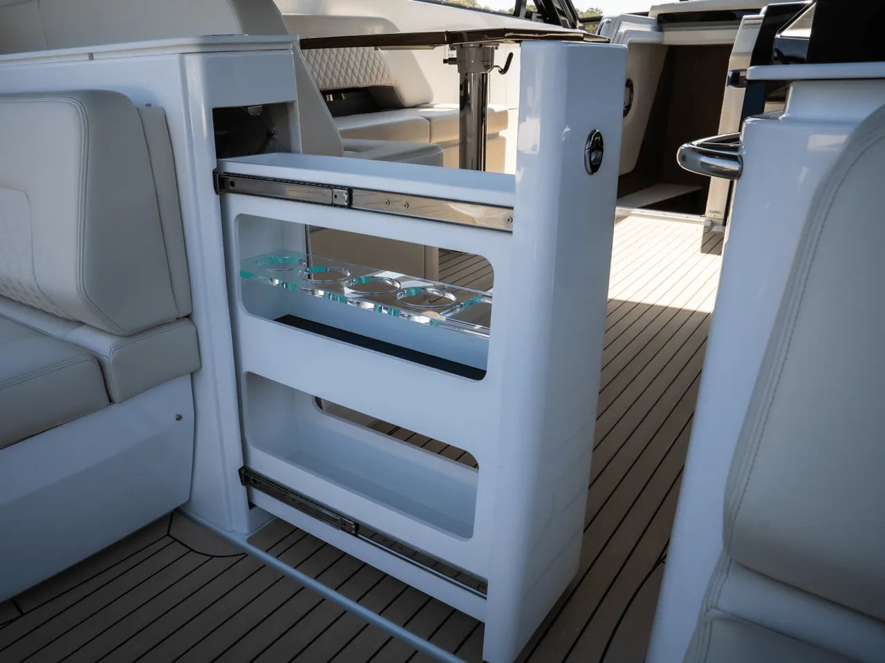 - Luxurious Bow Lounge: A powered door leads to a spacious and comfortable bow area, featuring a power high-low table, JL Audio speakers, a chiller box (no ice needed!), and integrated trash can. An optional foredeck shade offers respite from the sun.