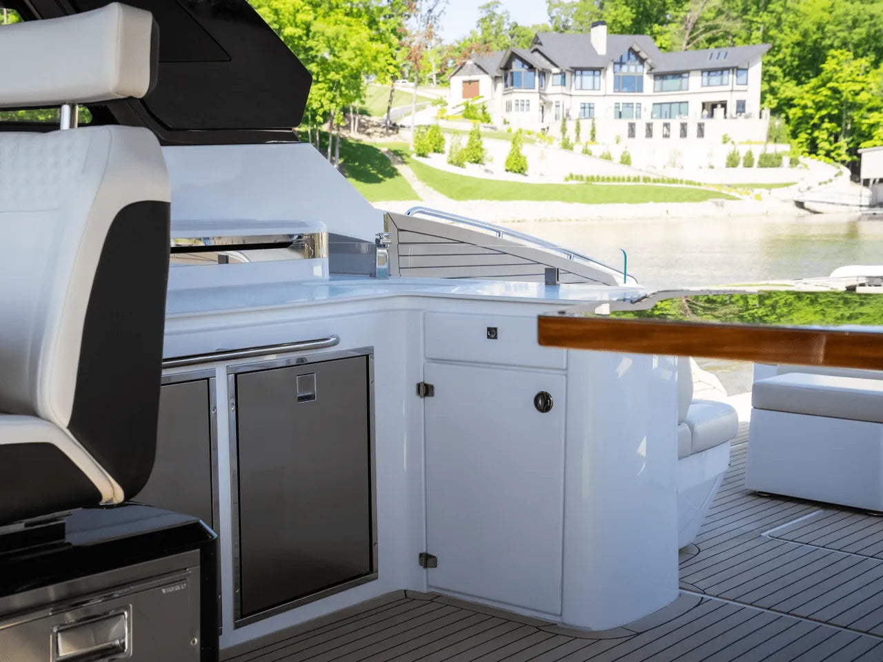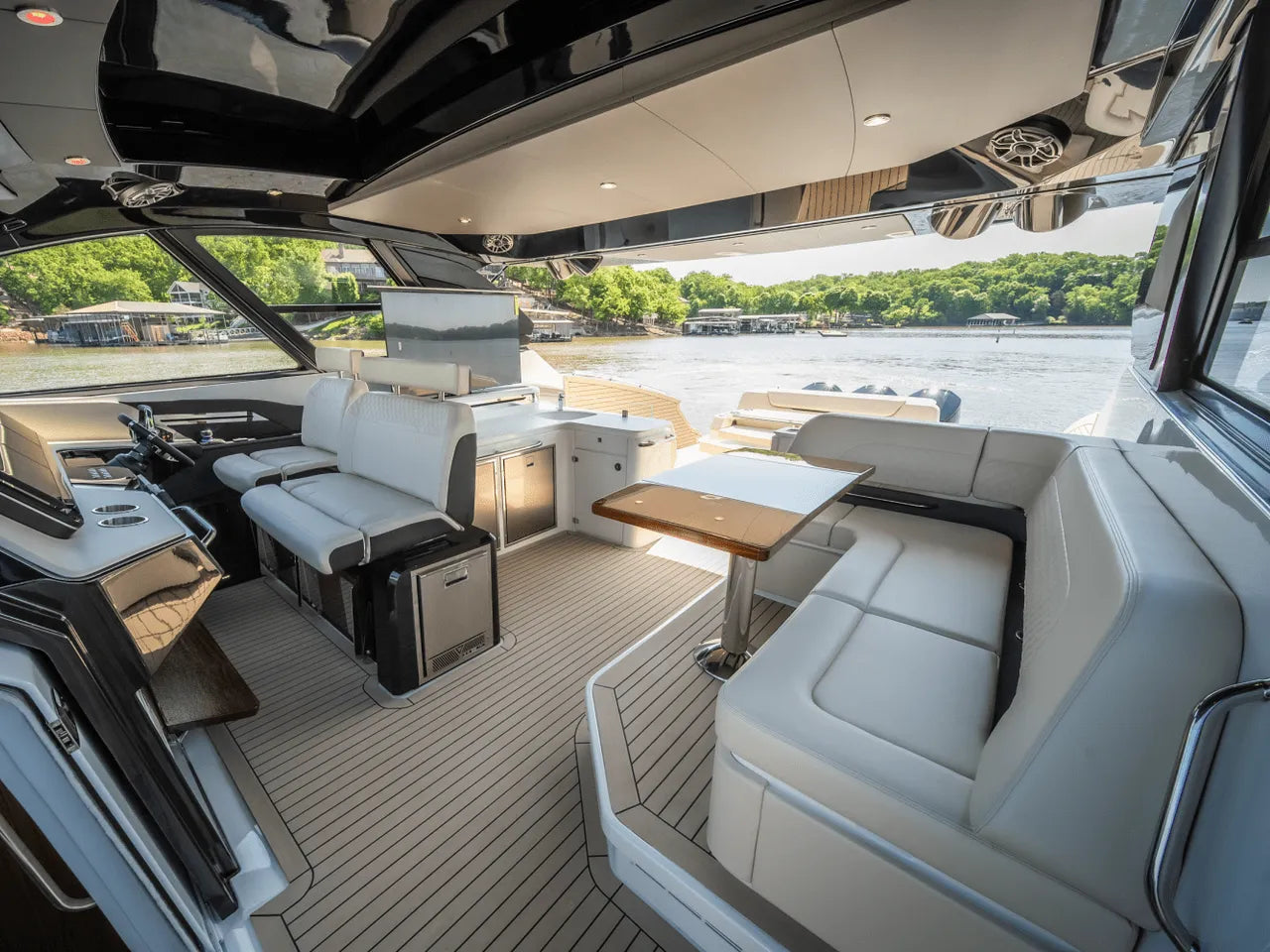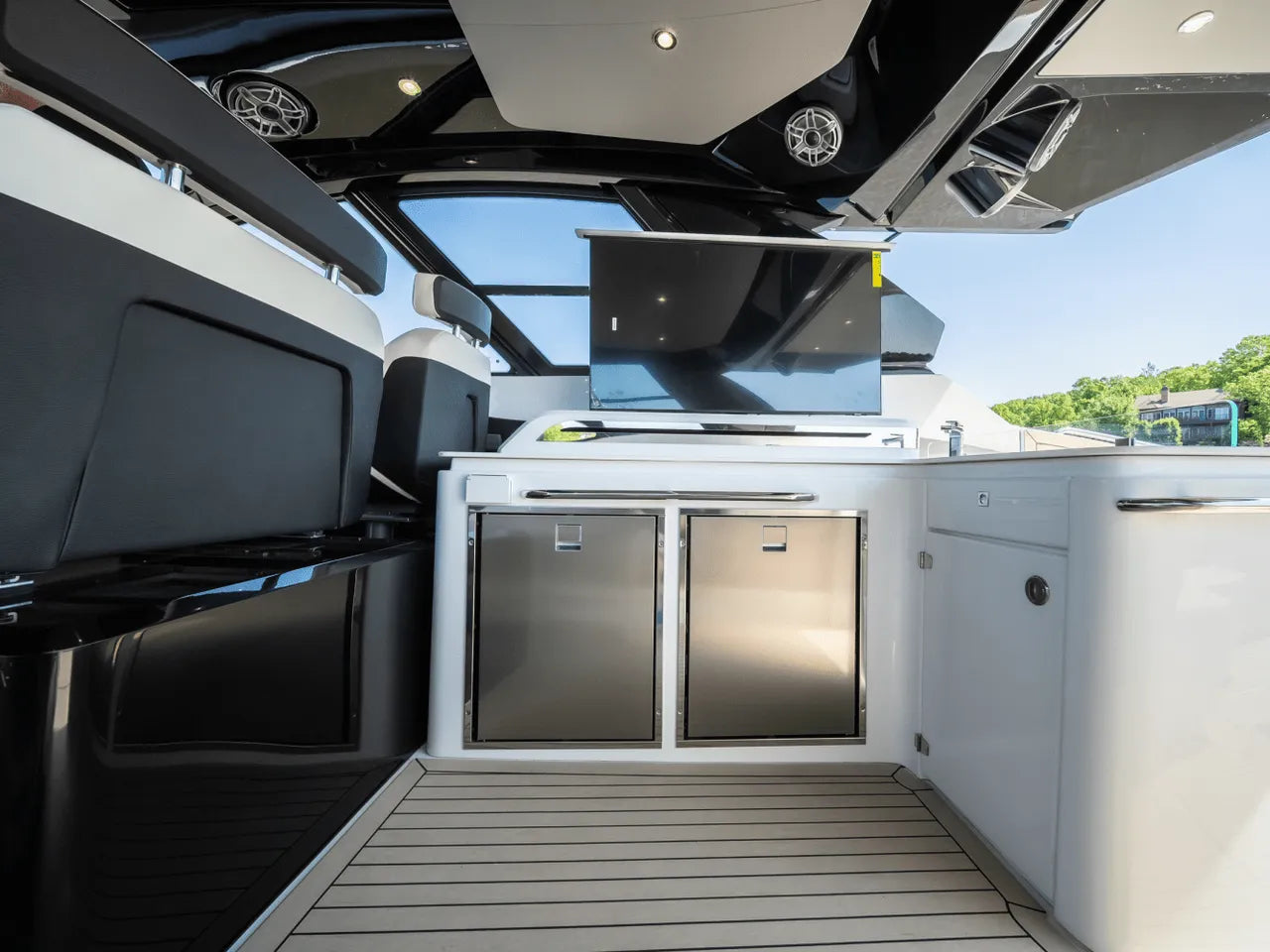 - Generous Cockpit: The cockpit is a hub for socializing, offering abundant seating, a powerful factory stereo system, and a well-appointed wet bar with two large refrigerators, an ice maker, and a retractable pop-up television. An optional second grill in the transom further enhances entertaining possibilities.