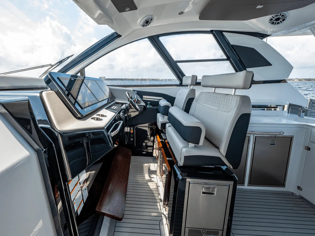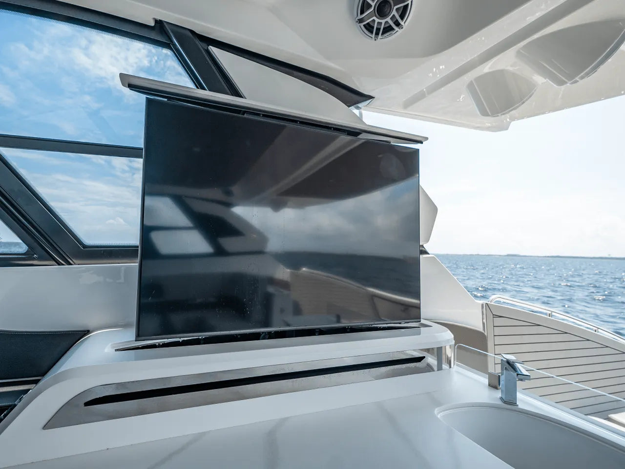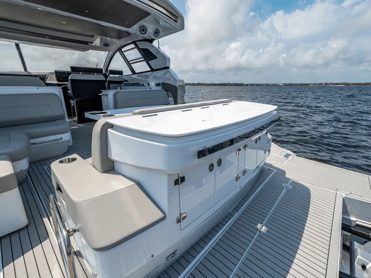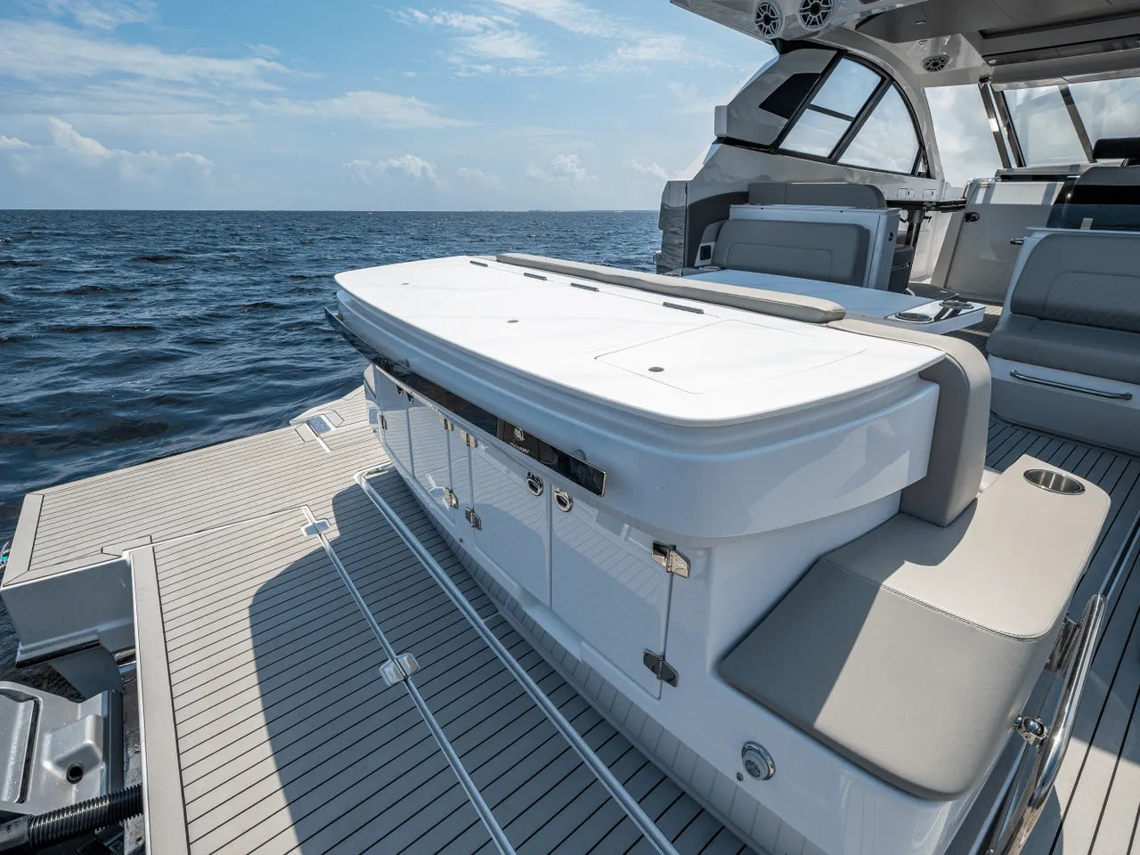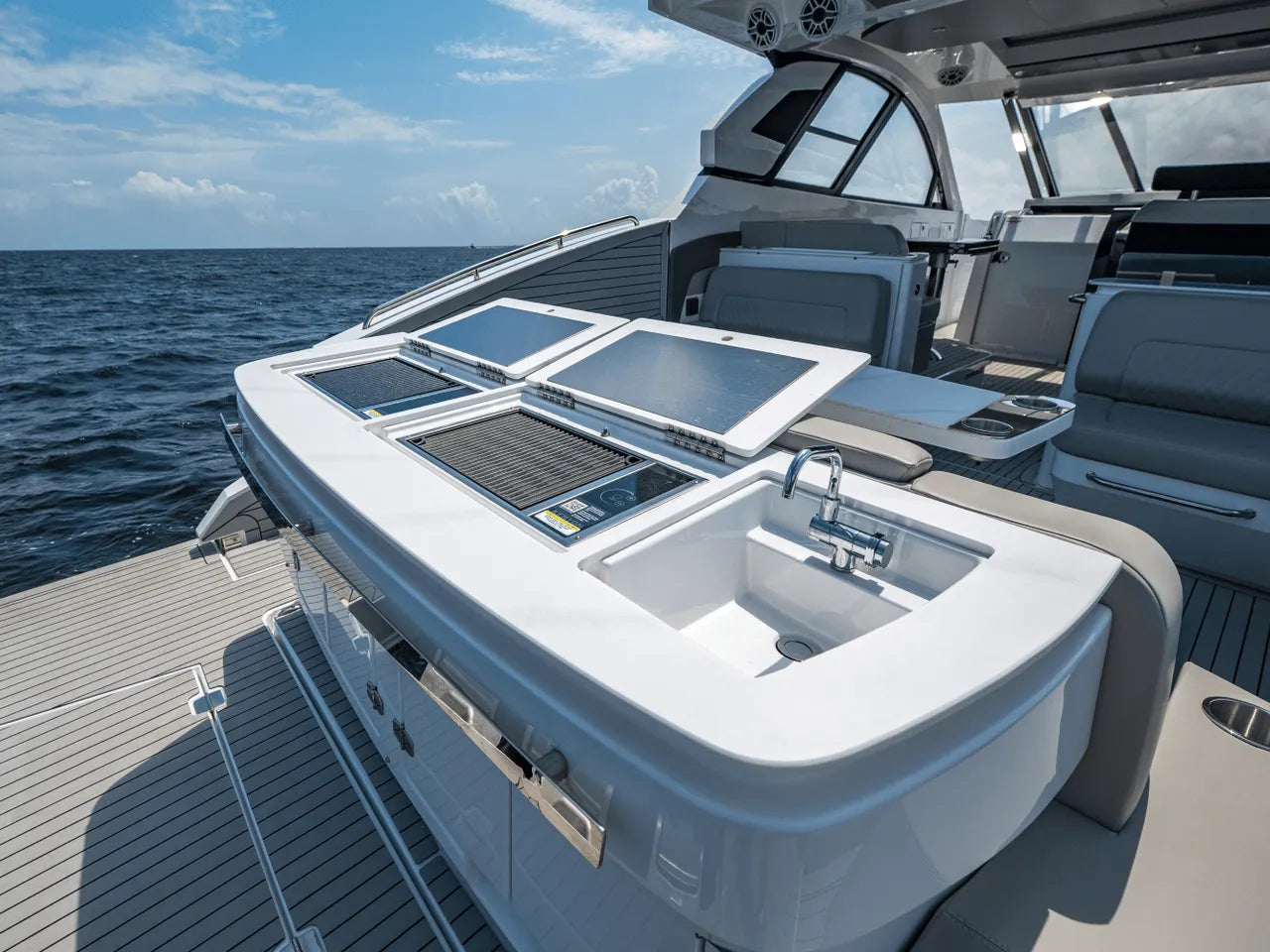 - Luxury & Entertainment: The expansive cockpit is an entertainer's dream, featuring two electric grills, a 55" Cockpit TV, and an additional refrigerator at the wet bar to keep all your refreshments chilled. The 120V Ice Maker at the helm seat ensures you'll never run out of ice.