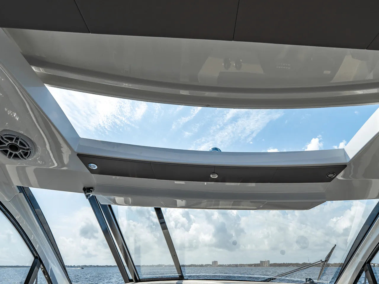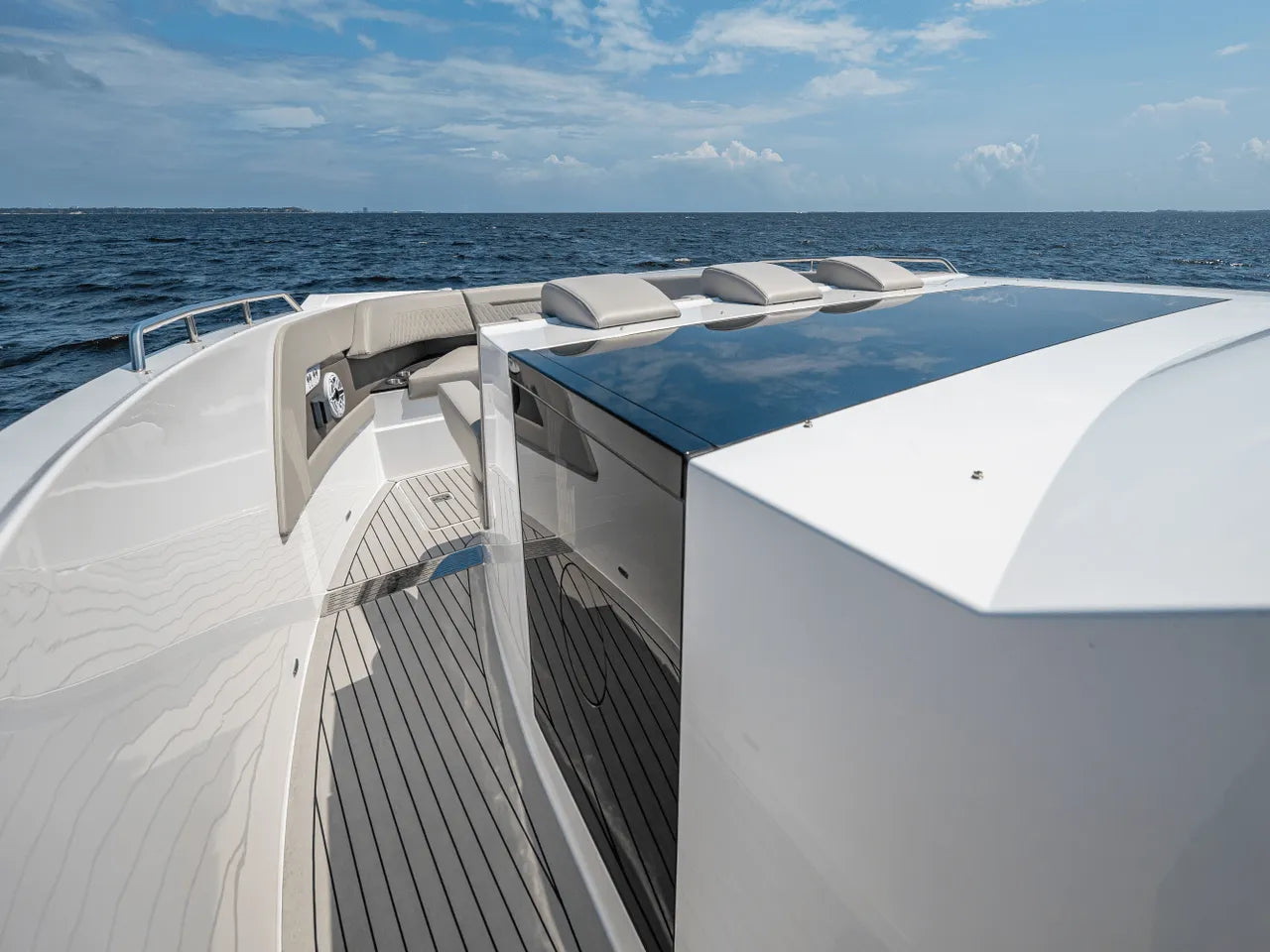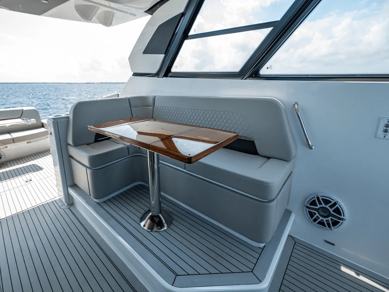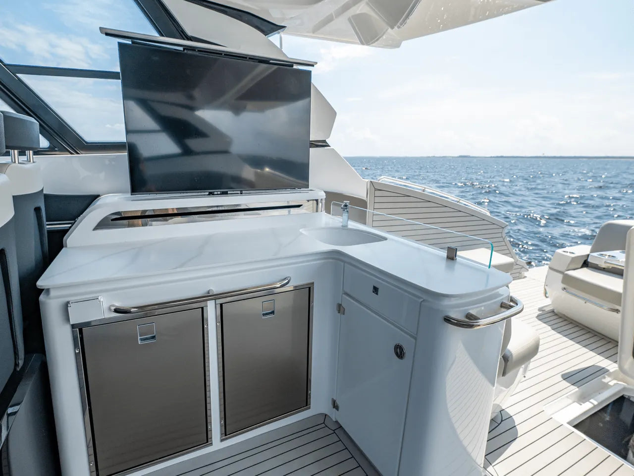 - Luxury & Entertainment: The expansive cockpit is an entertainer's dream, featuring two electric grills, a 55" Cockpit TV, and an additional refrigerator at the wet bar to keep all your refreshments chilled. The 120V Ice Maker at the helm seat ensures you'll never run out of ice.
