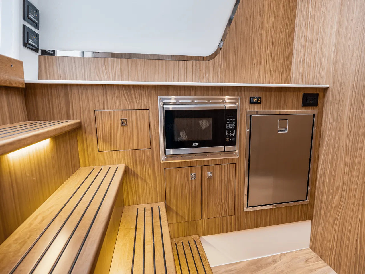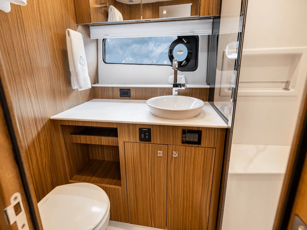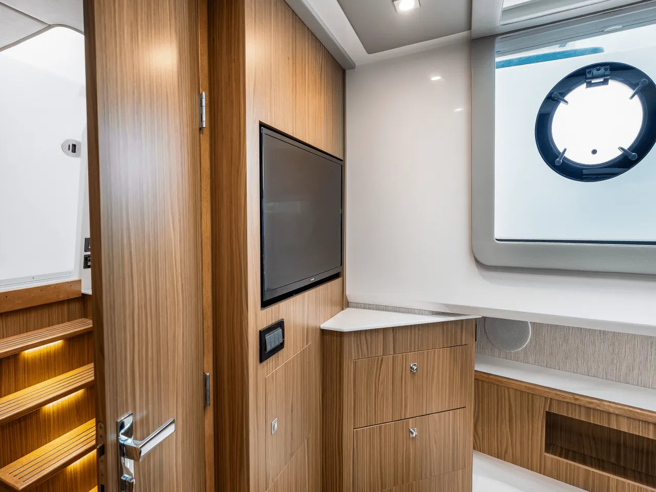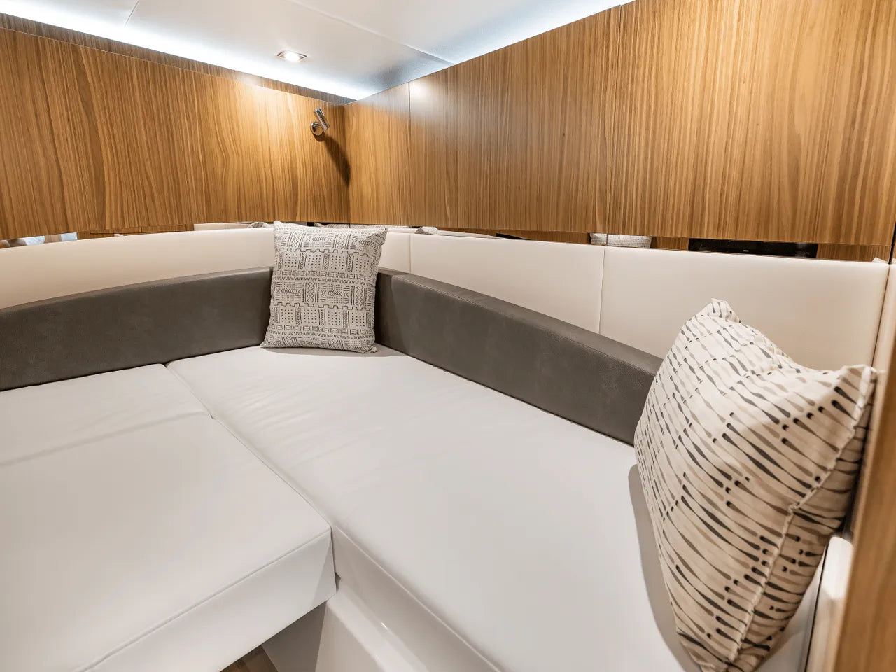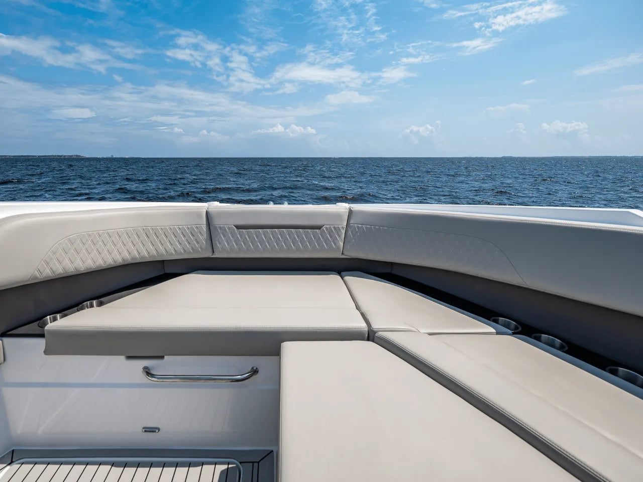 - Luxury & Entertainment: The expansive cockpit is an entertainer's dream, featuring two electric grills, a 55" Cockpit TV, and an additional refrigerator at the wet bar to keep all your refreshments chilled. The 120V Ice Maker at the helm seat ensures you'll never run out of ice.