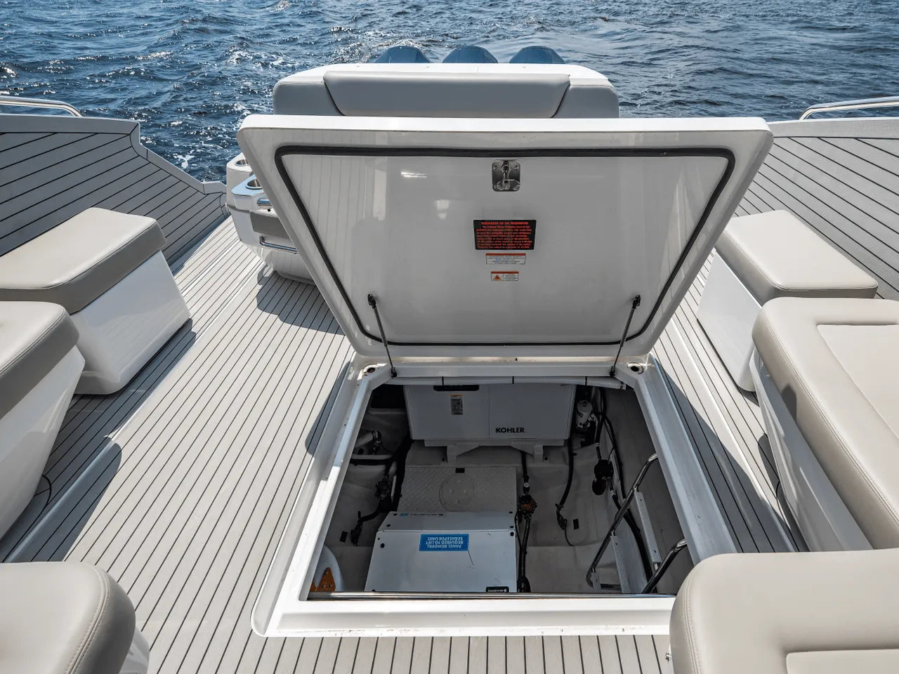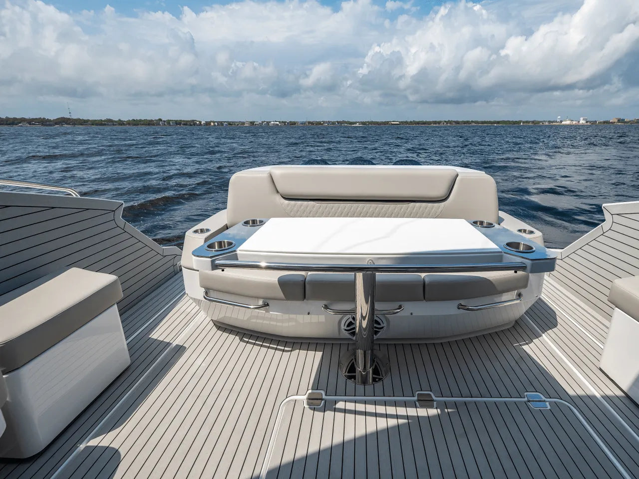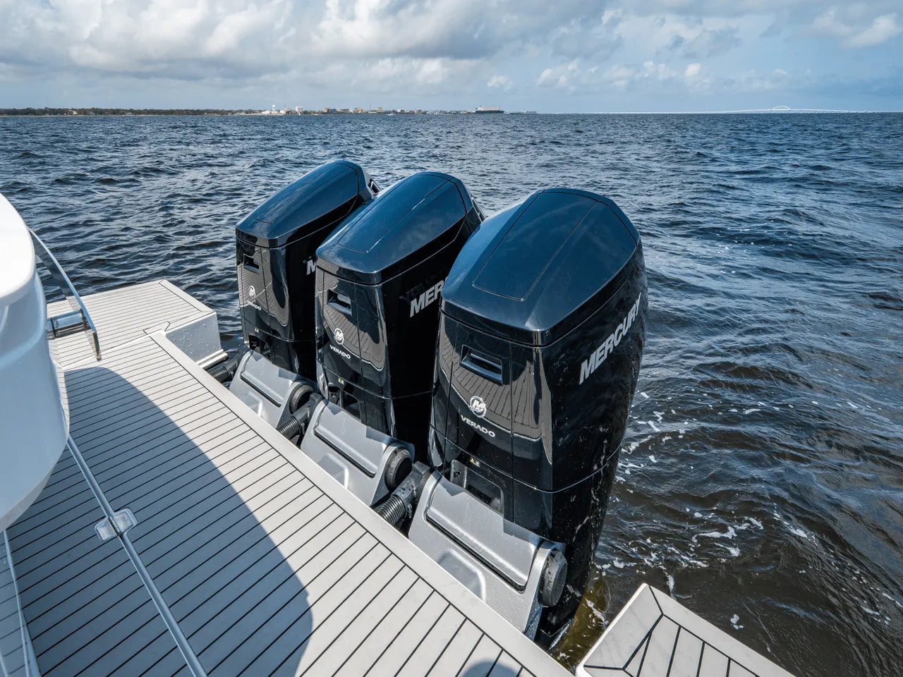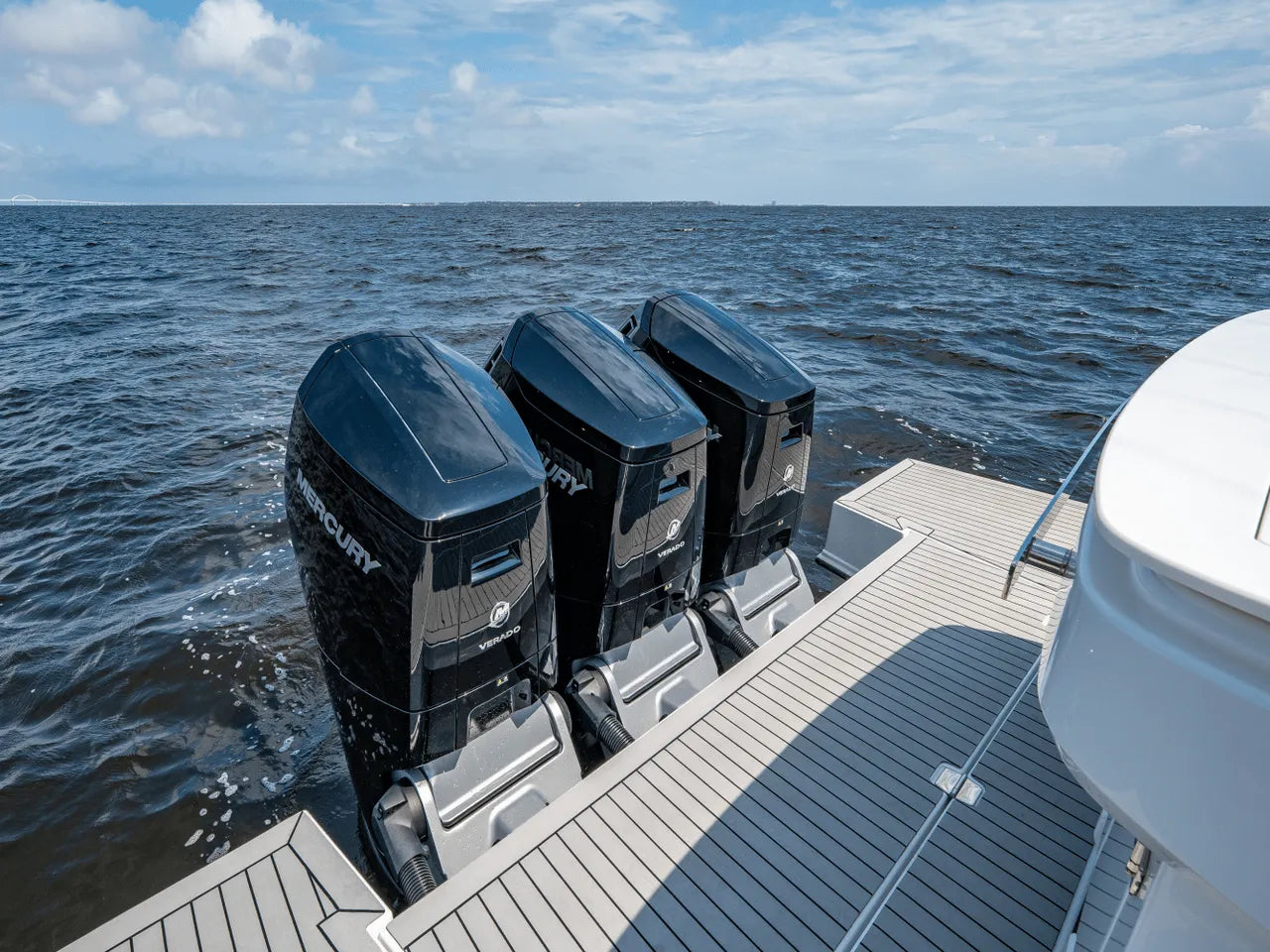 - Unmatched Power & Technology: This yacht is equipped with triple 600 HP Mercury outboard engines with Joystick Piloting for Outboards (JPO), providing an incredible 1,800 horsepower for exhilarating performance. The SeaKeeper 6 Stabilization System ensures a smooth and stable ride at all speeds and greatly reduces roll at anchor.