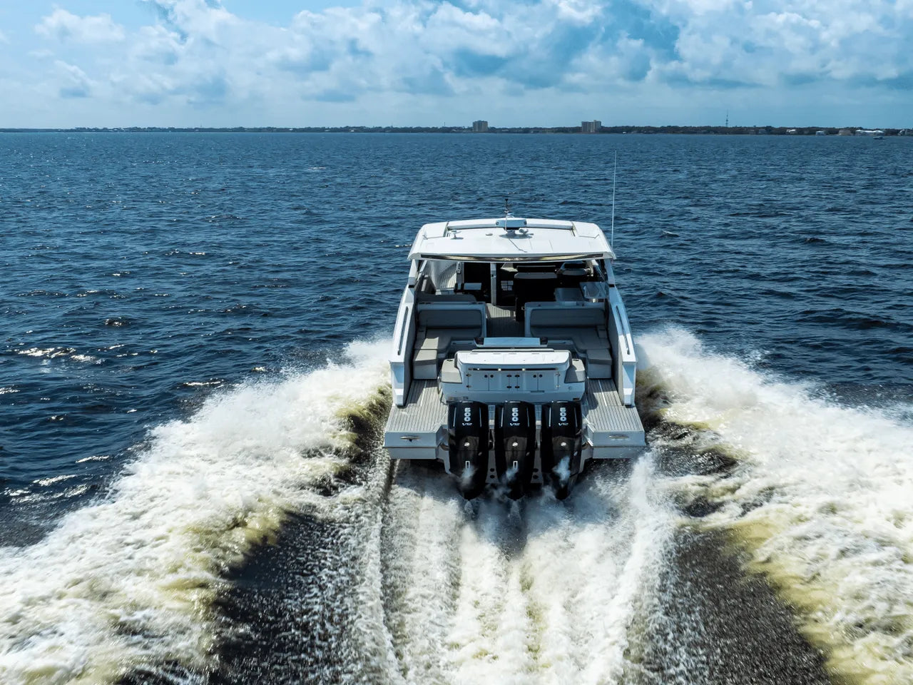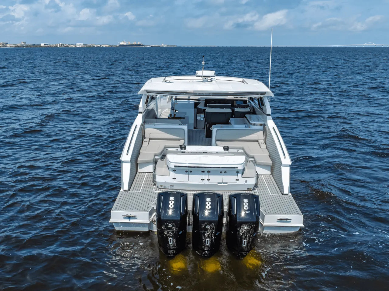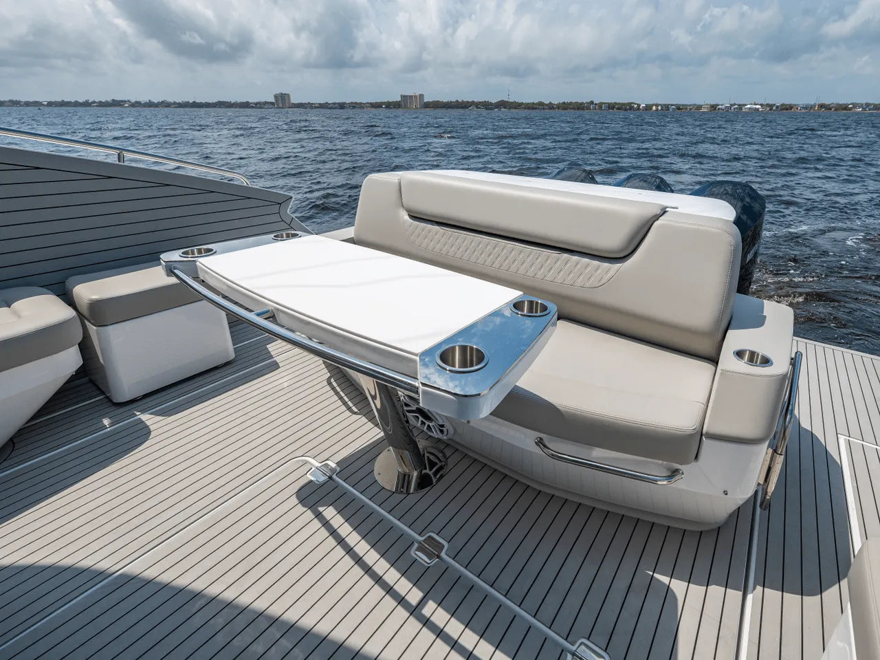 - Unmatched Power & Technology: This yacht is equipped with triple 600 HP Mercury outboard engines with Joystick Piloting for Outboards (JPO), providing an incredible 1,800 horsepower for exhilarating performance. The SeaKeeper 6 Stabilization System ensures a smooth and stable ride at all speeds and greatly reduces roll at anchor.