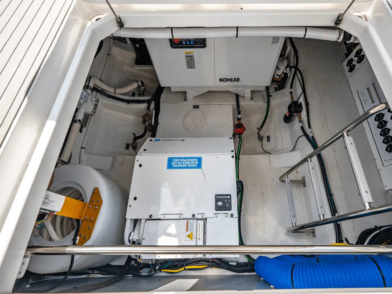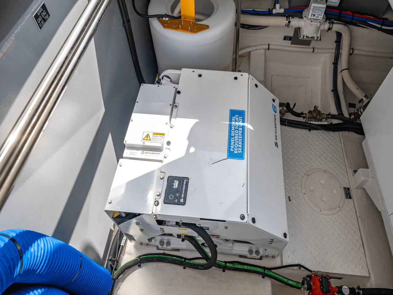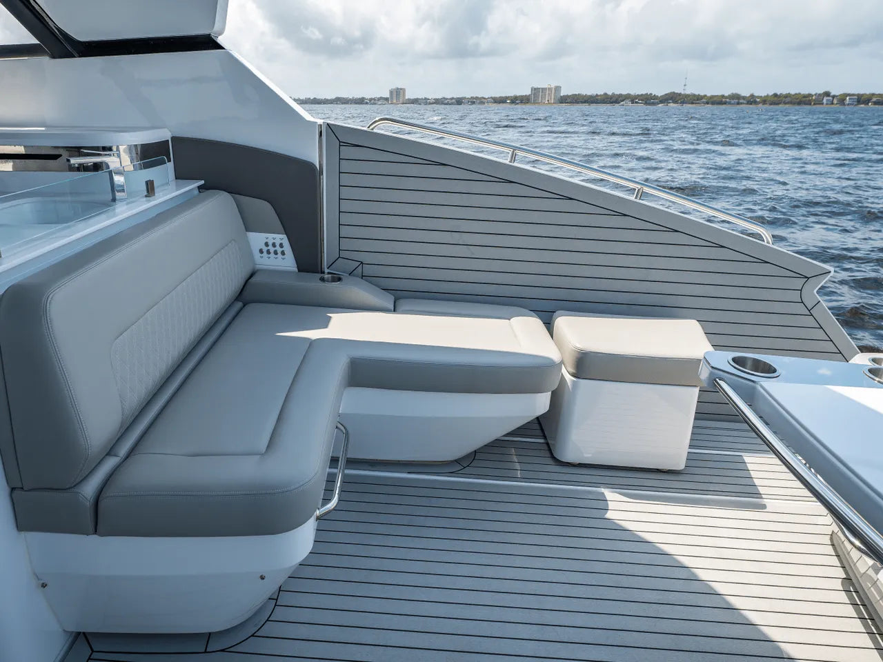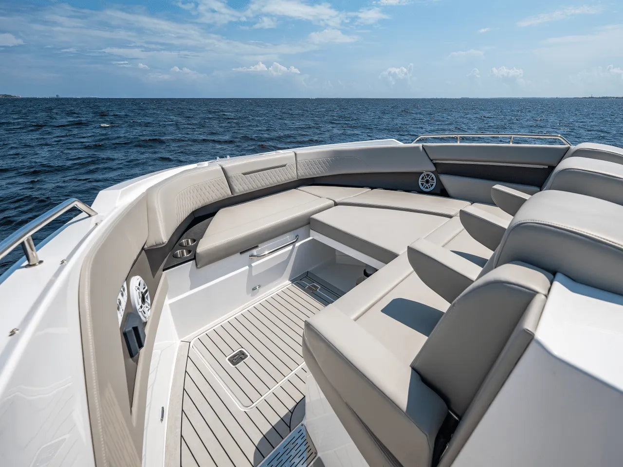 - Unmatched Power & Technology: This yacht is equipped with triple 600 HP Mercury outboard engines with Joystick Piloting for Outboards (JPO), providing an incredible 1,800 horsepower for exhilarating performance. The SeaKeeper 6 Stabilization System ensures a smooth and stable ride at all speeds and greatly reduces roll at anchor.