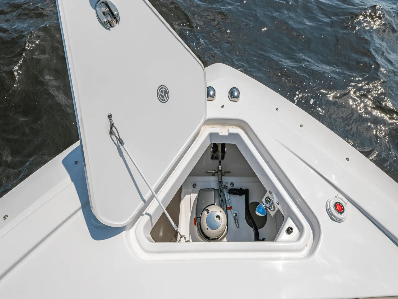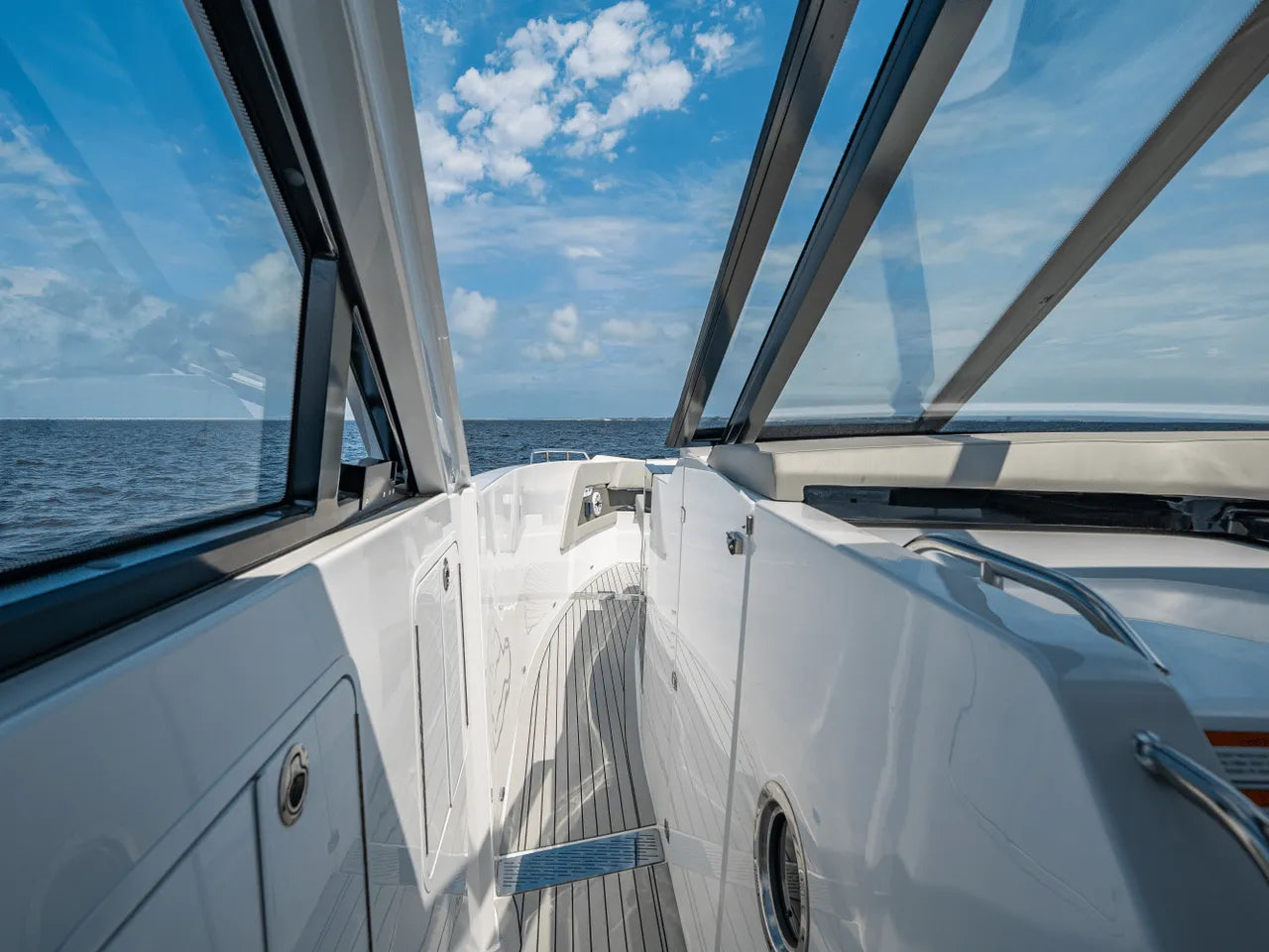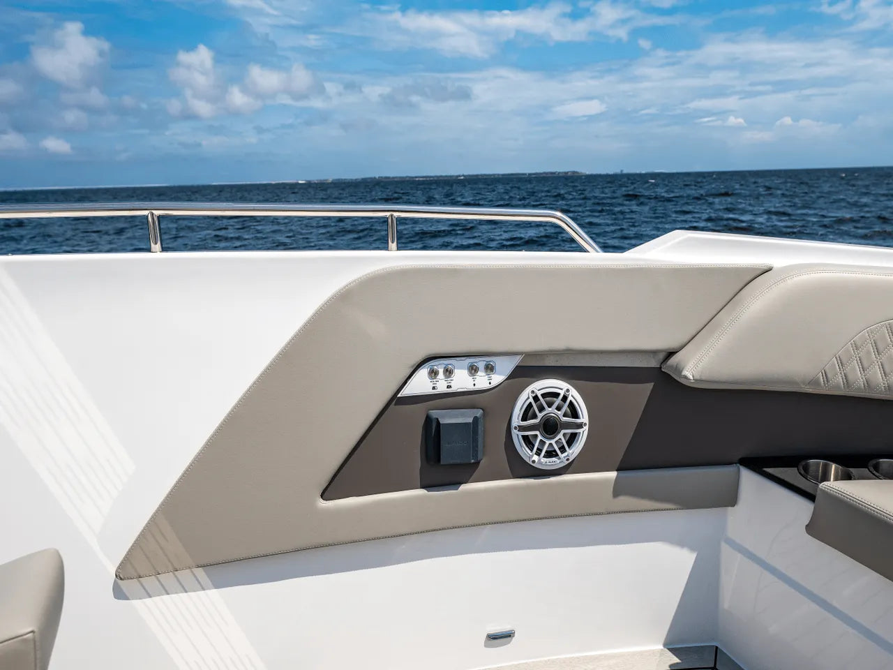 - Advanced Navigation: Navigate with confidence using the Joystick Piloting system, which makes docking and close-quarters maneuvering effortless. The helm is fully equipped with a Simrad Radar and a Simrad VHF Radio for enhanced safety and communication.